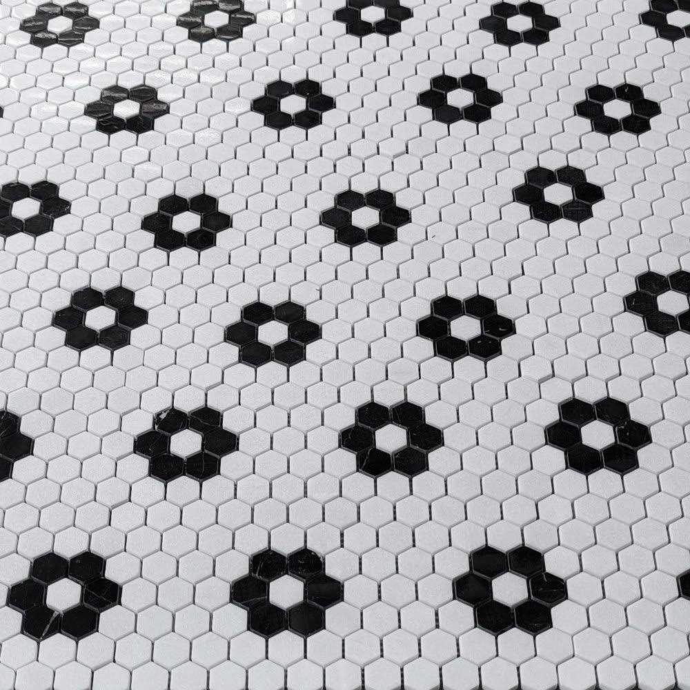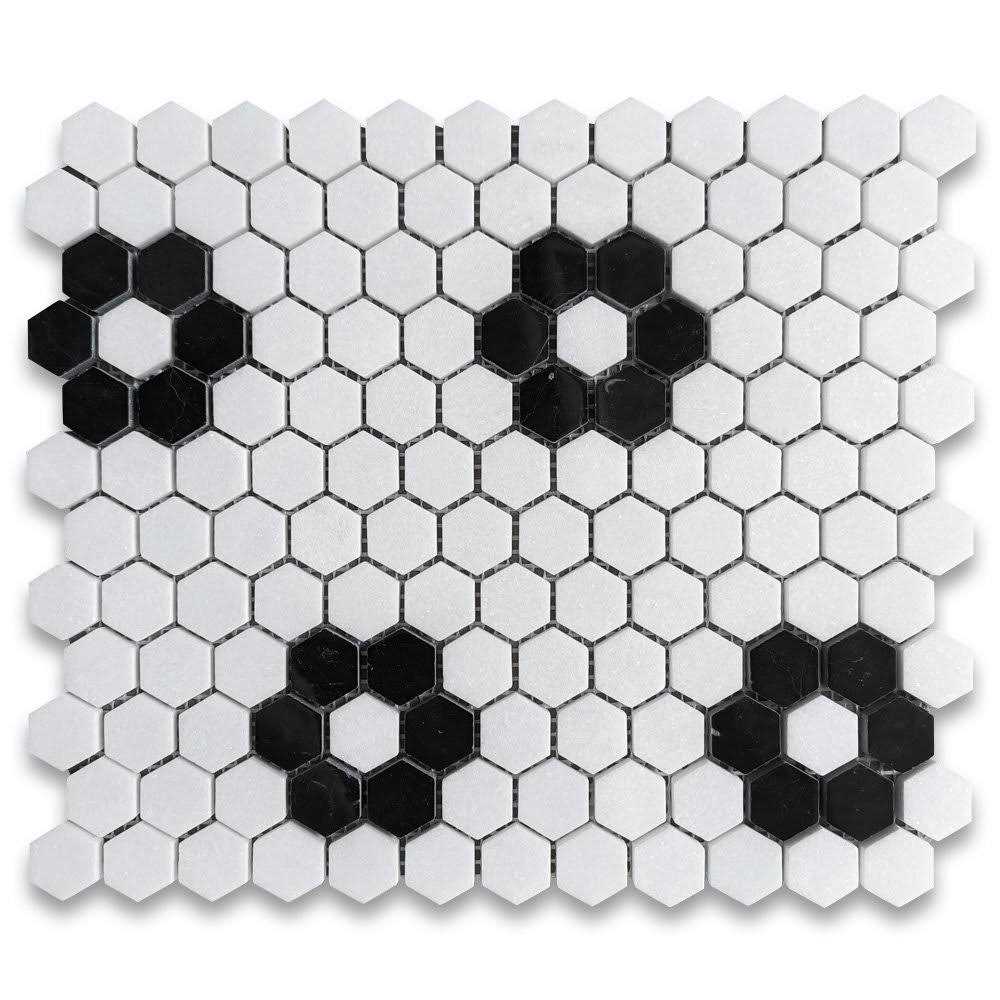 Premium Grade White Thassos Marble Hexagon Rosette Mosaic Tiles w/ Nero Marquina Black. Greek Thassos White Pure White Crystal Marble Polished 1 inch Hexagon Rosette Mosaic Wall & Floor Tiles are perfect for any interior projects. The 1 inch Thassos White Marble Hexagon Mosaic tiles can be used for a kitchen backsplash, bathroom flooring, shower surround, dining room, entryway, spa. Our timeless Glossy White Thassos Marble Rosette Mosaic tiles with a large selection of coordinating products is available and include arabesque, fish scale, penny round, herringbone, basketweave mosaics, 12×12, 18×18, 12×24, subway tiles, moldings, borders, and more.