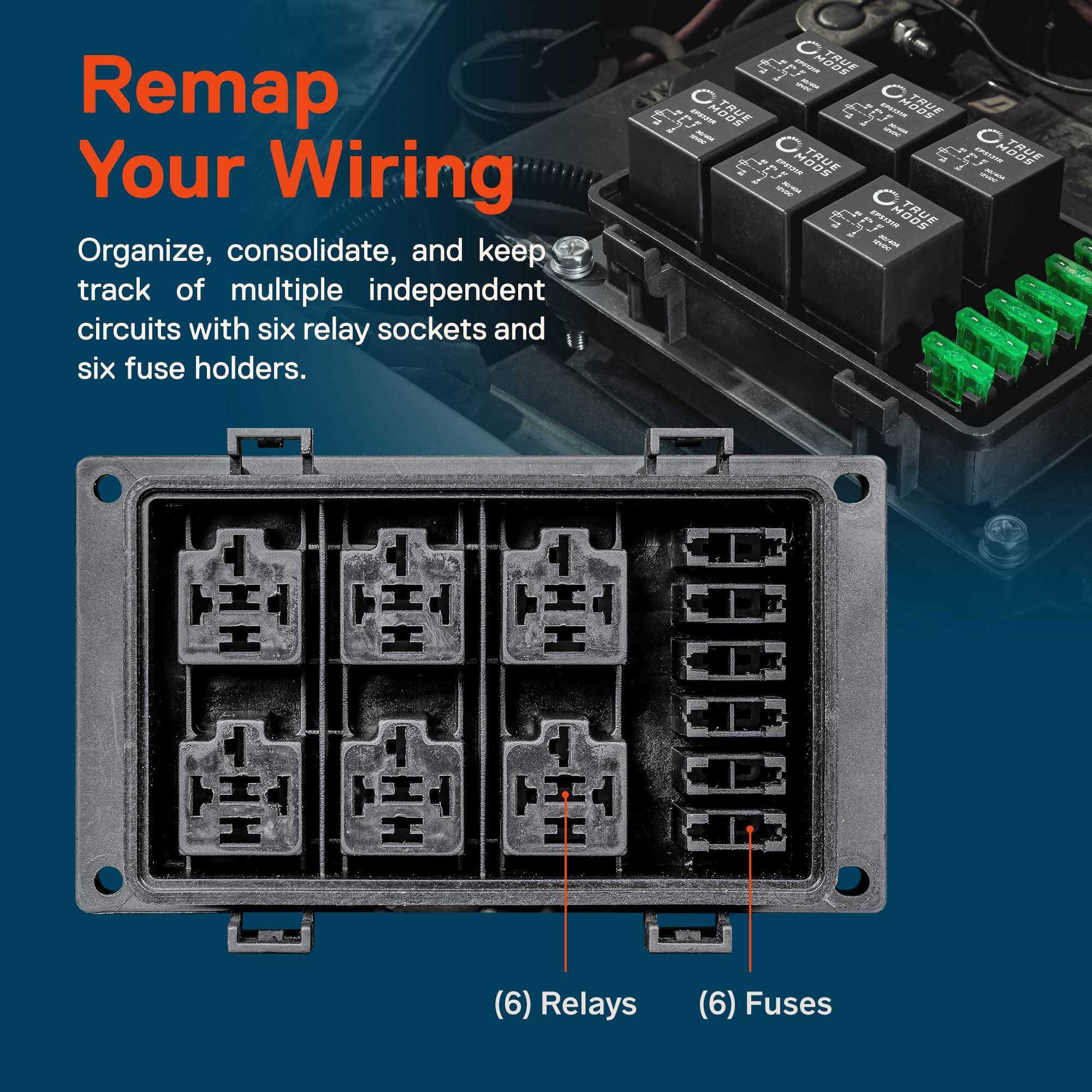 One and Done You designed the system, now let us supply the parts. Because “getting there is half the fun” doesn’t apply to electrical work. Making Your Adventures Possible You’re 100 miles into a multi-day off-road expedition, the sun is going down, and the last thing you want to worry about is whether or not your lights will turn on when you flip the switch; if you’ve trusted your fuses and relays to a waterproof relay box from us, you know you have nothing to worry about. Made from durable, heat-resistant nylon 66 and packed with enough silicone gaskets and seals to give it an IP65 waterproof rating, this relay box is prepared for any contingency. Get Lost, Just Not in Your Wiring Trying to organize harnesses, fuses, and relays can quickly have you driving in circles. Get your bearings with a dedicated, waterproof relay box. Like a trail map for your wiring, our relay box is the most efficient way to consolidate, organize, and keep track of all your aftermarket accessories. Boasting a six relay/fuse capacity, this relay box is more than capable of powering and protecting up to six independent circuits.