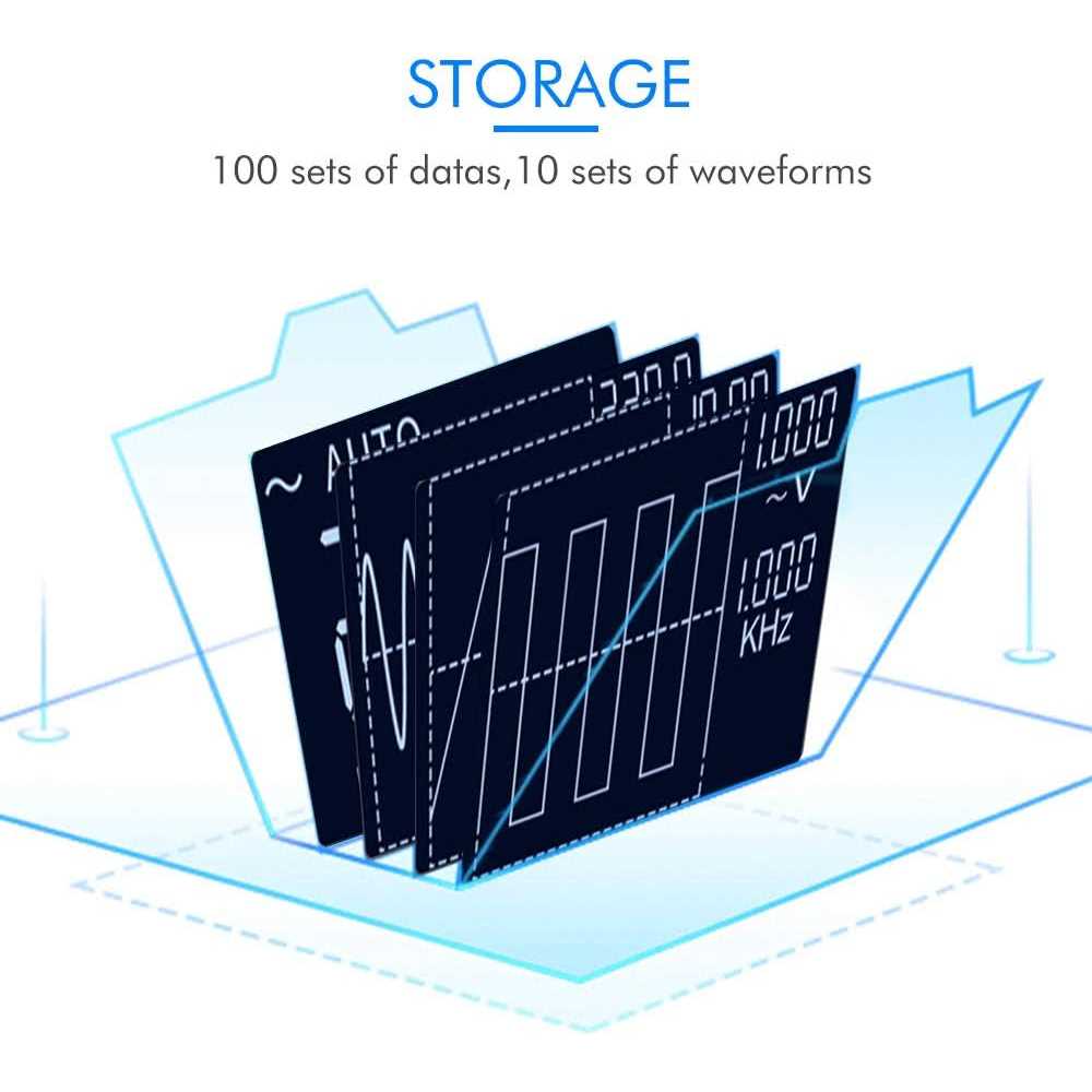 Digital multimeter with 200K high-speed A/D sampling, 4000 counts auto-range, one-button switch of graphical waveform display during measurement. High reliability with panel calibration technology and memory calibration, sparing the need for adjustment with potentiometer. Storing 100 sets of data and 10 waveforms independently. Capable of holding waveform and data during measurement, easy to view and analyze. Displaying historical data and real-time measurement on the same screen with particular record reading mode for easy comparison.