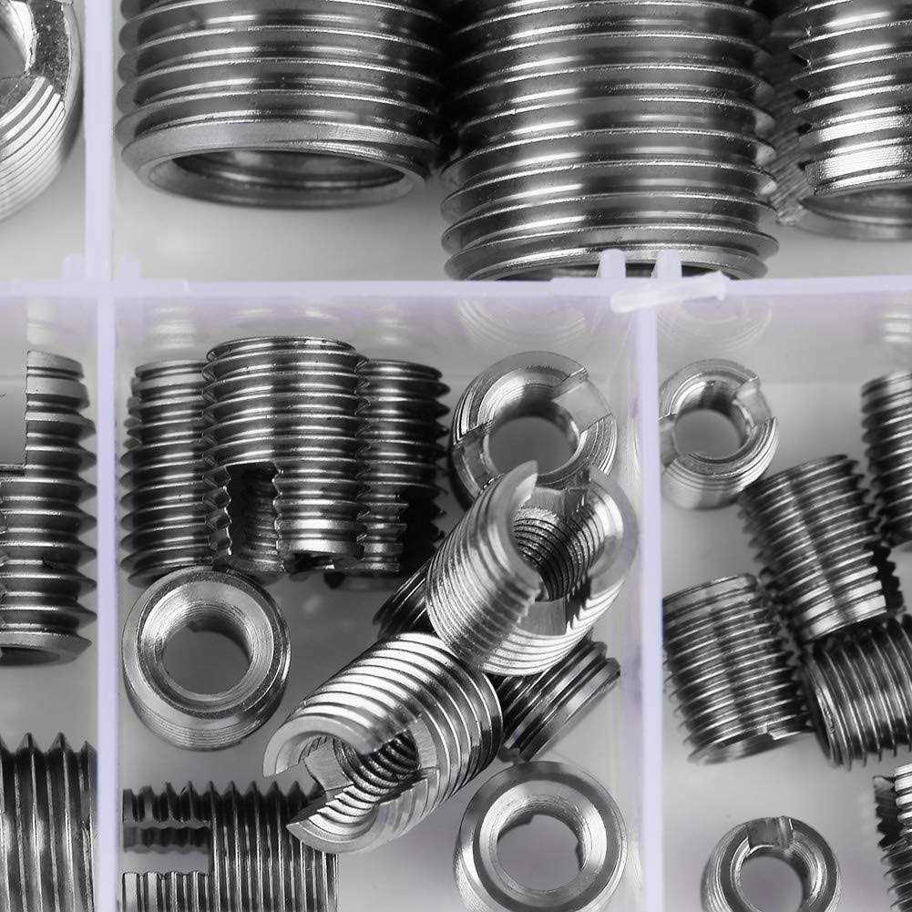 50Pcs 302 Stainless Steel Inner Thread Self Tapping Thread Inserts Set Thread Reinforce Repair Tool Specification: Material: Stainless Steel Quantity: 50pcs Color: Silver Package Weight: Approx. 192g/6.8oz Package list: 10 x M30.5-M50.5 L6 10 x M40.7-M6.50.75 L8 10 x M50.8-M81.0 L10 5 x M61.0-M101.5 L12 5 x M81.25-M121.5 L15 5 x M101.5-M141.5 L18 5 x M121.75-M161.5 L22 1 x Storage Case Note: Due to the difference between monitors and light effect, the pictures may not reflect the actual color of the item. Product Features HIGH QUALITY: Made of high quality stainless steel, it is of high hardness and low abrasion. FEATURE: With certain elasticity and even load, it is resistant to vibration to avoid loosening. Greatly improve strength and stability of screws connection. GOOD CHARACTER: Solid, is not easy to slick, deep thread, uniform force, no burr in thread, clear and tidy. EASY TO USE: Easy and quick to install with only one assembly tool. It can also repair the damaged thread by install it into thread hole. APPLICATION: It enjoys a reputation in manufacturing fields such as aviation, automobiles, steam turbines, electronic communications, computers, lamps, molds, mechanical equipment, radiators, and semiconductor equipment.