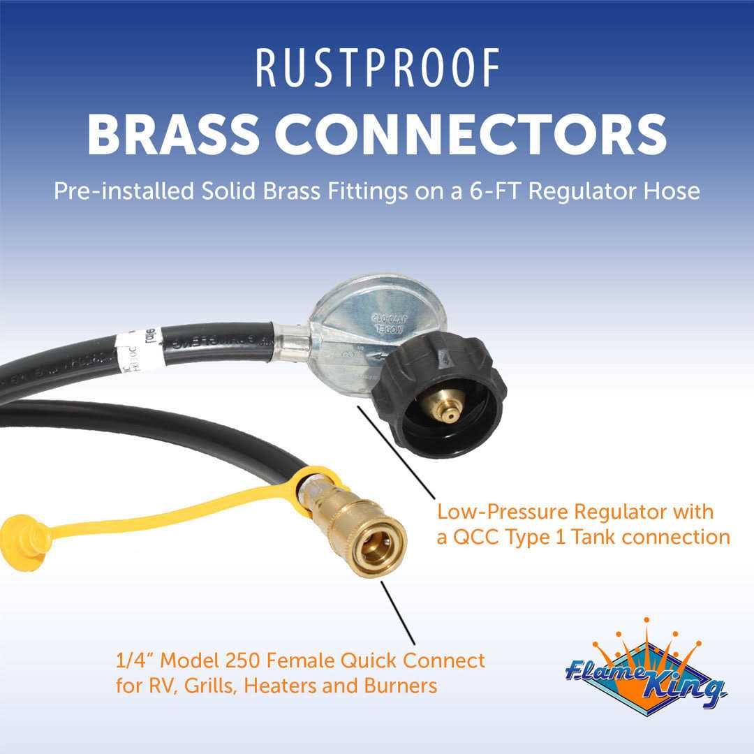 - Solid Brass Pre-installed Fittings on a 6-FT Regulator Hose (72 inches overall length)