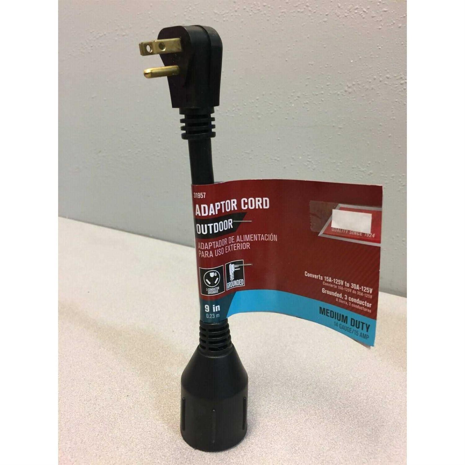 L Appliance Cord Sold ASCase of 3 Product Details Gauge Conductors: 14/3 STW Volts: 125 volt Length: 9 in. Maximum Amperage: 15 amps Indoor or Outdoor: Outdoor Maximum Wattage: 1875 watts Grounded Color: Black Insulation Material: PVC Premium grade PVC jacket 3 conductor grounded 15 amp male end converts to 30 amp female end Right angle cap