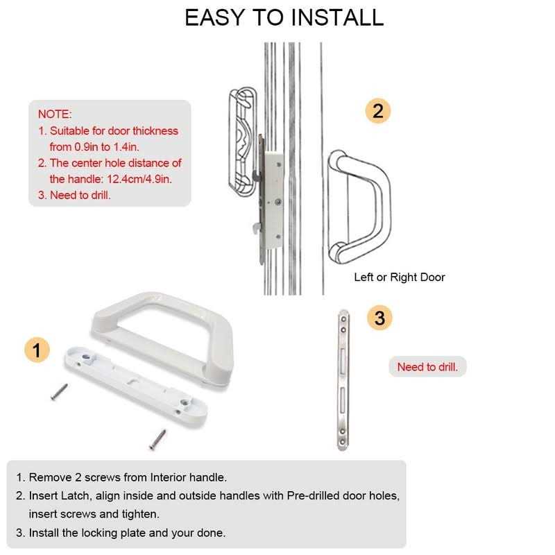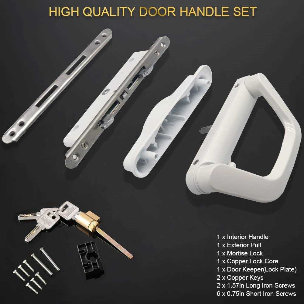 Sliding Patio Door Handle Set with Mortise Lock (Keyed) Features: Adjustable Lock Latch: Modified latch can be cut according to your door thickness. Can be adjusted for use on different sized doors. Reversible Handle Design: No matter your sliding glass door is left or right open, this handle can be installed perfectly. Keyed Pull Handle: Pull Handle has a key cylinder in it. You can lock by key from your outside yard to give you a mind peace safty home. Easy to Install: Step 1: Remove 2 screws from Interior handle. Step 2: Insert Latch, align inside and outside handles with Pre-drilled door holes, insert screws and tighten. Step 3: Install the locking plate and your done. Specifications: Color: White Material: Zinc and Aluminium Alloy with Die-Cast Handed Construction: Non-Handed(Reversible), Keyed Suitable for door thickness from 0.9in to 1.4in. The center hole distance of the handle: 12.4cm/4.9in. How to install and use: Please look at the pictures or videos carefully for the detailed process !!! Package Included: 1 x Interior Handle 1 x Exterior Pull 1 x Mortise Lock 1 x Copper Lock Core 1 x Door Keeper(Lock Plate) 2 x Copper Keys 2 x 1.57in Long Iron Screws 6 x 0.75in Short Iron Screws