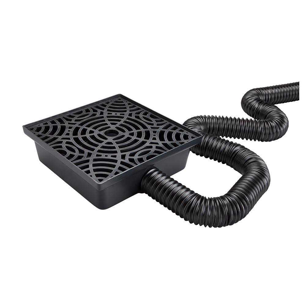 No digging required, low profile design can be hidden by covering with mulch, straw or other landscape cover Includes 8 ft. L of 2 in. flexible pipe to prevents water and foundation damage by diverting rain water around landscaping Made with a durable resin that can withstand all outdoor elements Compatible with all standard residential downspouts (2 in. x 3 in., 3 in. x 4 in., and round) Basin is 12-in D x 4.25-in. W x 12-in. W. Includes 2-drain pipe knockouts and a cap to close off 1-hole if only using 1-drain location Quickly remove damaging rainwater from your home with this low profile catch basin. This low-profile catch basin will give you the benefits of a buried drainage system without the cost or hassle of digging. The kit includes a 12-in. catch basin, a decorative drain grate and an 8-ft. stretch of corrugated drain pipe. Use one or both pipe knockouts to improve the flow of rainwater from all standard residential downspout sizes. Once installed, you can cover the pipe with mulch, rocks or other ground cover so it disappears into the landscaping. 12-in D x 4.25-in. W x 12-in. W