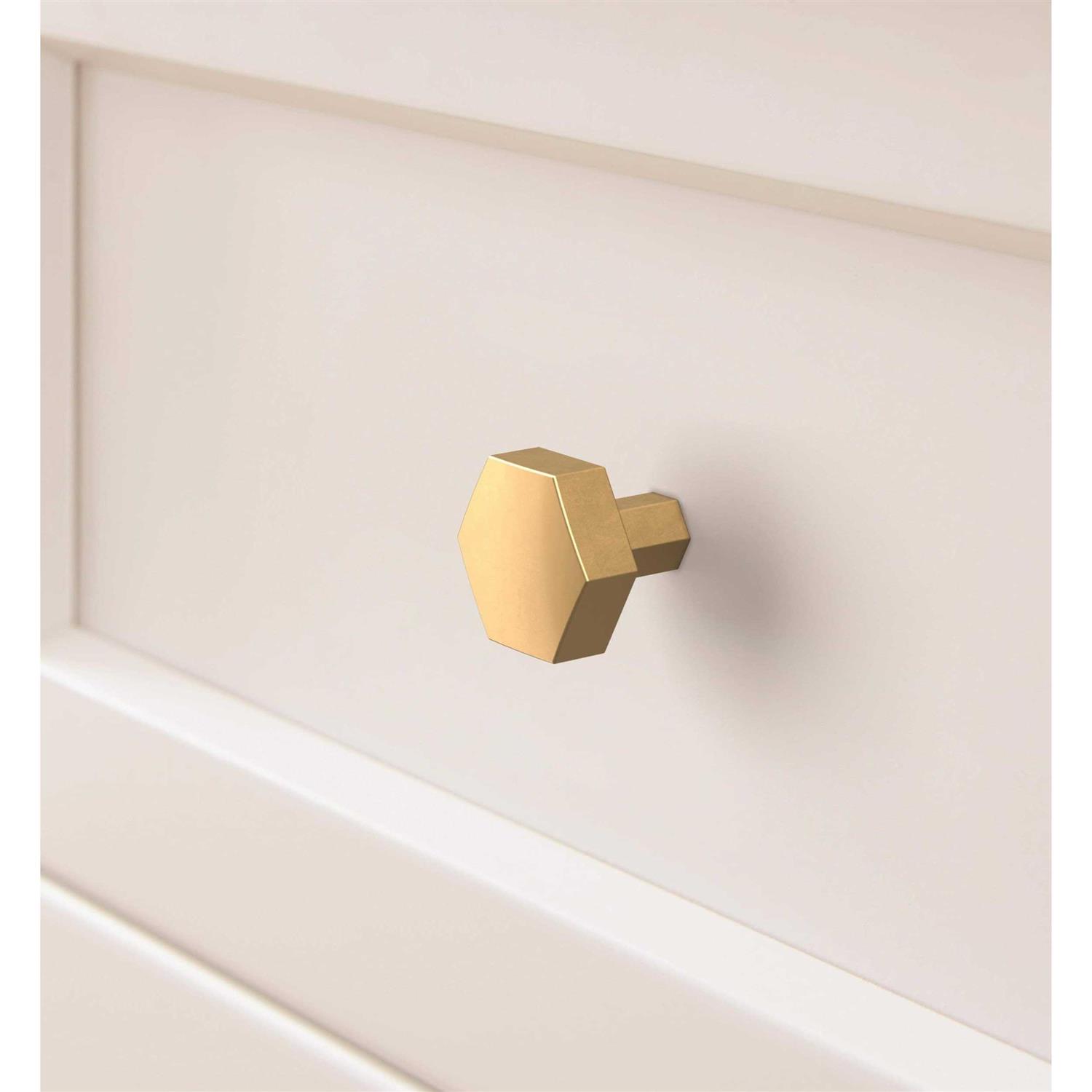 With a hexagonal design, this stylish knob has a modern look. Cast in zamak, it is 32mm wide and projects 32mm. Available in a champagne bronze, matte black or satin nickel finish. Mounting hardware included.