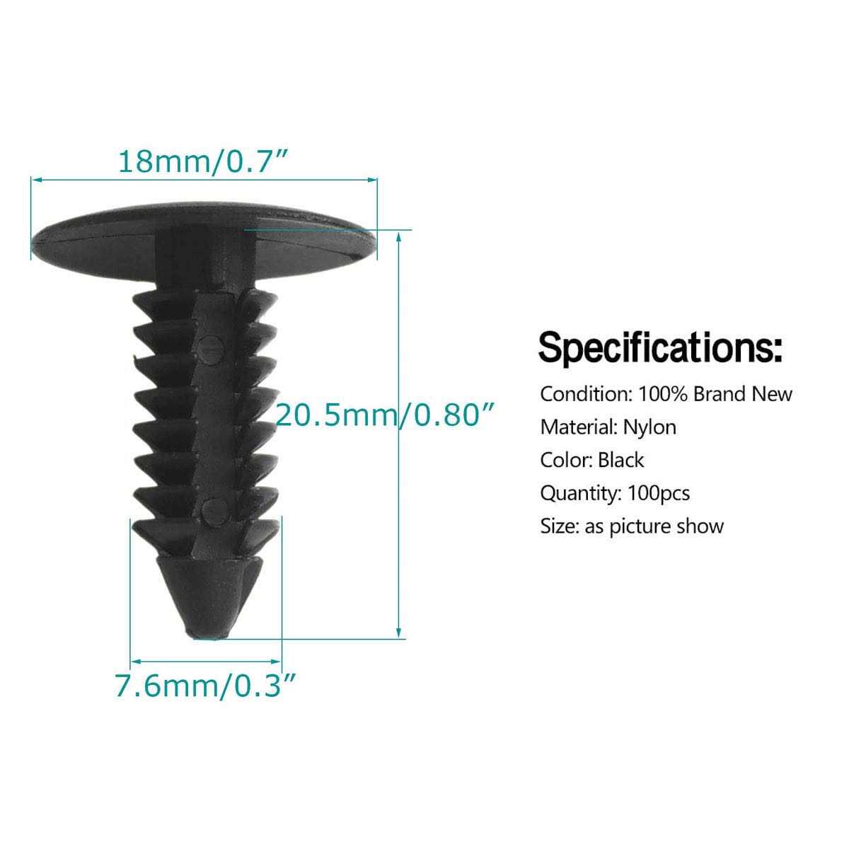 These bumper clips are made of high-quality black nylon material, anti-wear and anti-corrosion, would not break or crack easily during use. 7mm (1/4″) Hole Size; .095″ – .540″ Panel Range Universal Push Clip. Theses push clips are widely used for trim panel clips, door trim clips, door panel clips, bumper clips, Fender clips, engine cover and splash shield retainers replacement. It always covers some applications include telecom equipment, motor vehicles, domestic appliances, furniture and electrical equipment. Package Include: 100PCS Fender& Bumper Shield Retainer.