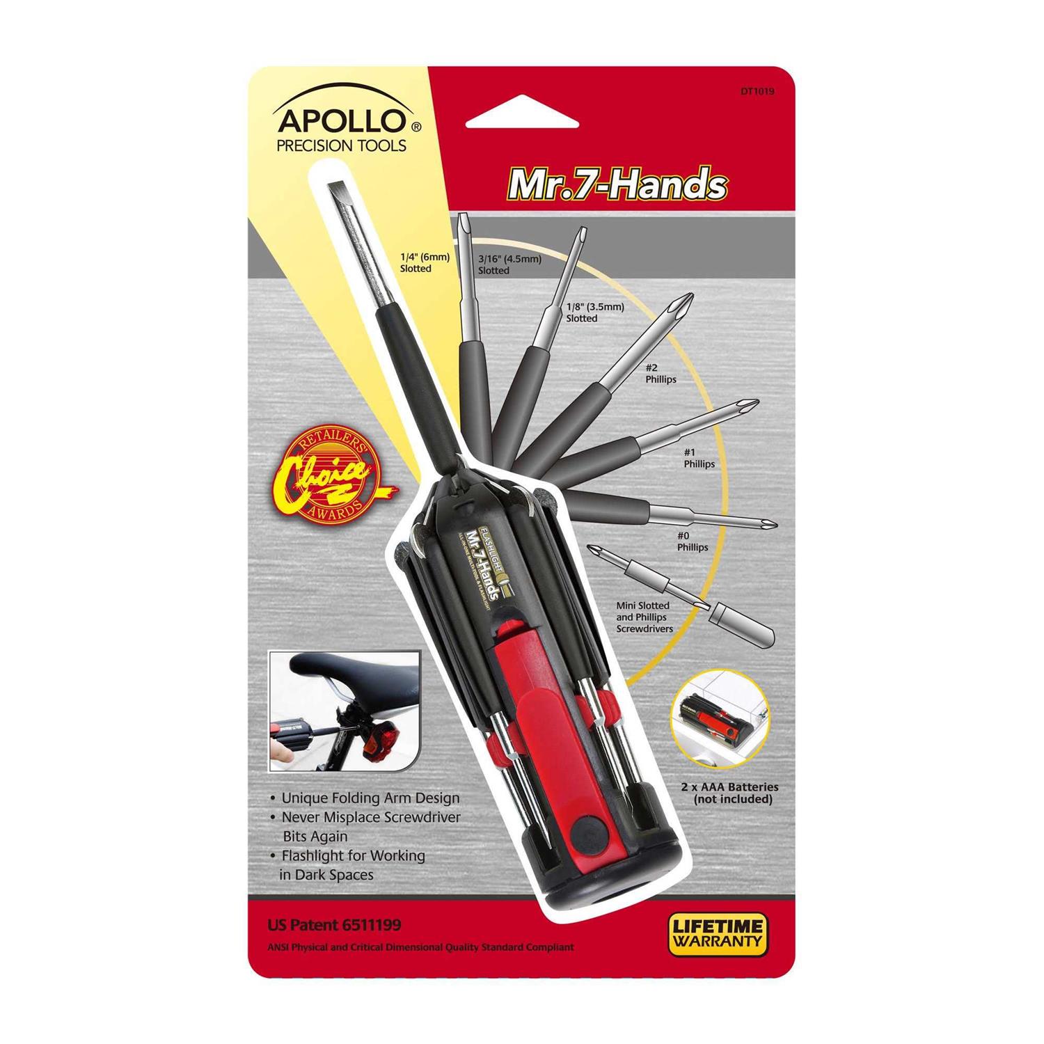 Mr 7 Hands has 7 screwdrivers in one thanks to its unique folding arm design. Never misplace screwdriver bits again! Worklight for working in dark spaces.