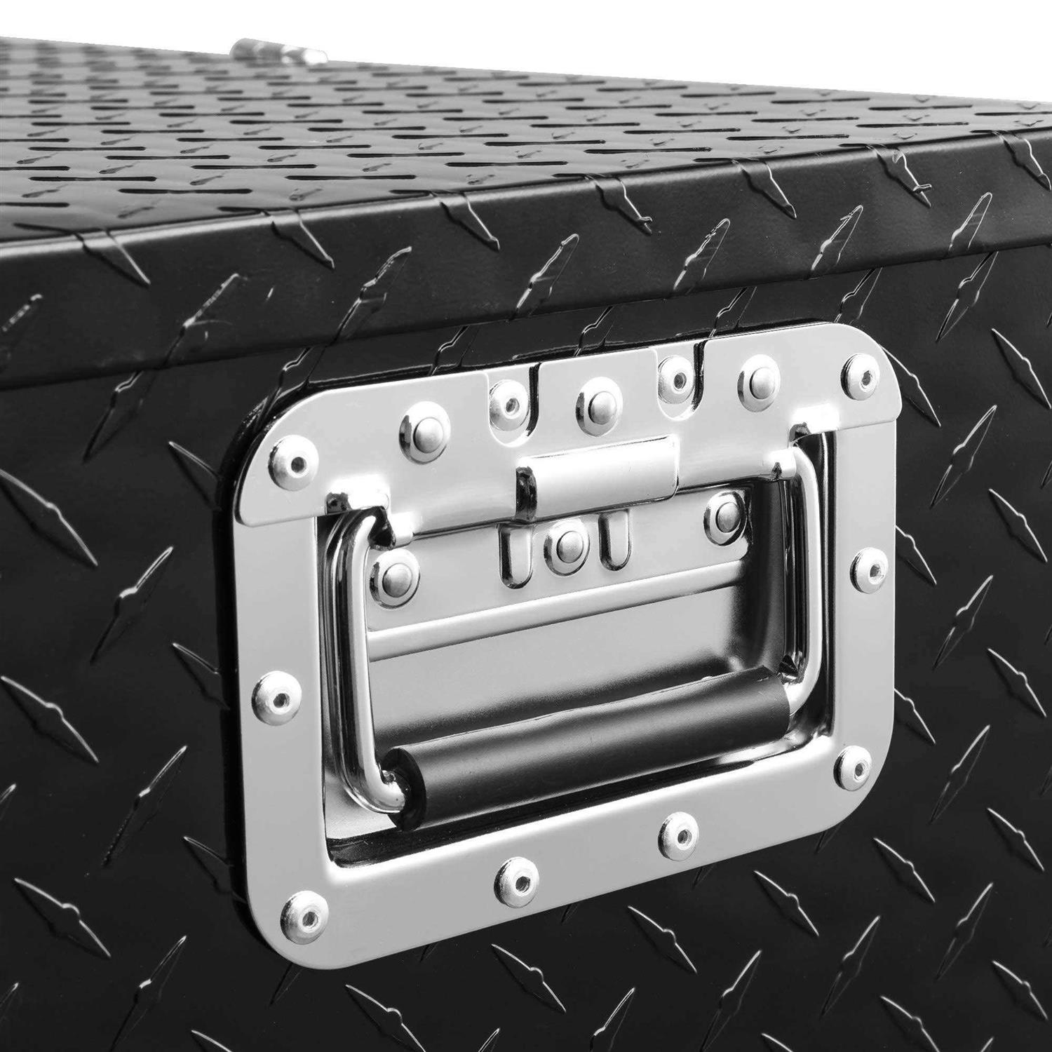 A sleek and compact toolbox, designed to save space while providing extra storage under your truck bed. Rugged aluminum material with a diamond tread pattern and polished finish offers excellent corrosion and rust resistance, providing years of long-lasting durability. This chest can be used to store and organize all your tools, accessories, and camping supplies in a secure spot. It features a secure stainless steel lock and comes with side handles that provide an easy grip for convenient portability. The quick-release doors feature a tight seal that prevents moisture from getting in to ensure all your tools and accessories stay protected against the harsh weather. Overall dimensions of this toolbox are: 30″(L) x 13″(W) x 9.6″(H) and the package includes one 30-inch aluminum toolbox and two lock keys.