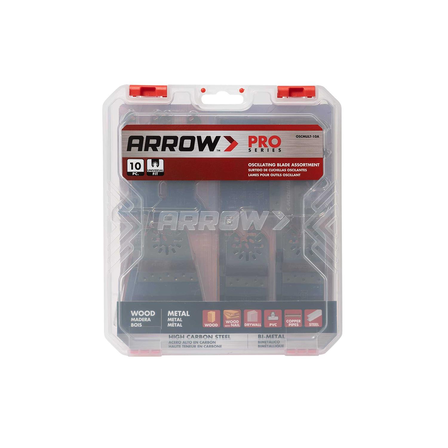 The Arrow Oscillating Multi-Tool Blade Assortment Set contains a variety set of blades designed with a universal fit for use with most major brands of oscillating multi-tools. Military grade high carbon steel and bi-metal blades provide coverage and extended performance for numerous cutting applications, including wood and nails, drywall, PVC, steel, and nonferrous materials. Supplied in a built-tough storage case to store multiple blades and accessories. Contains: 2 x Drywall Blades. 4 x Fast Cutting Wood Blades. 1 x Wood with Nails Blade. 2 x General Purpose Blades. 1 x Metal Cutting Blade.