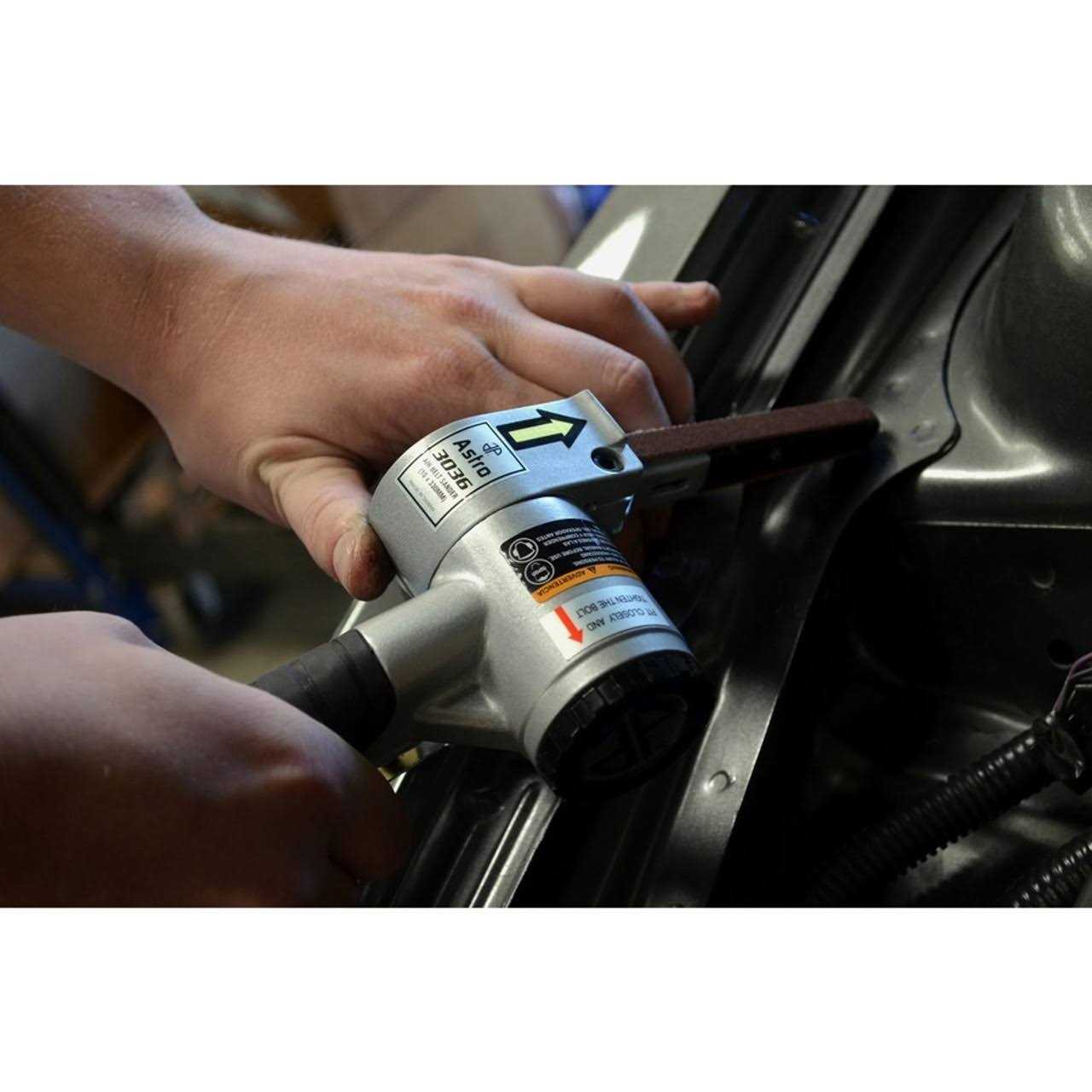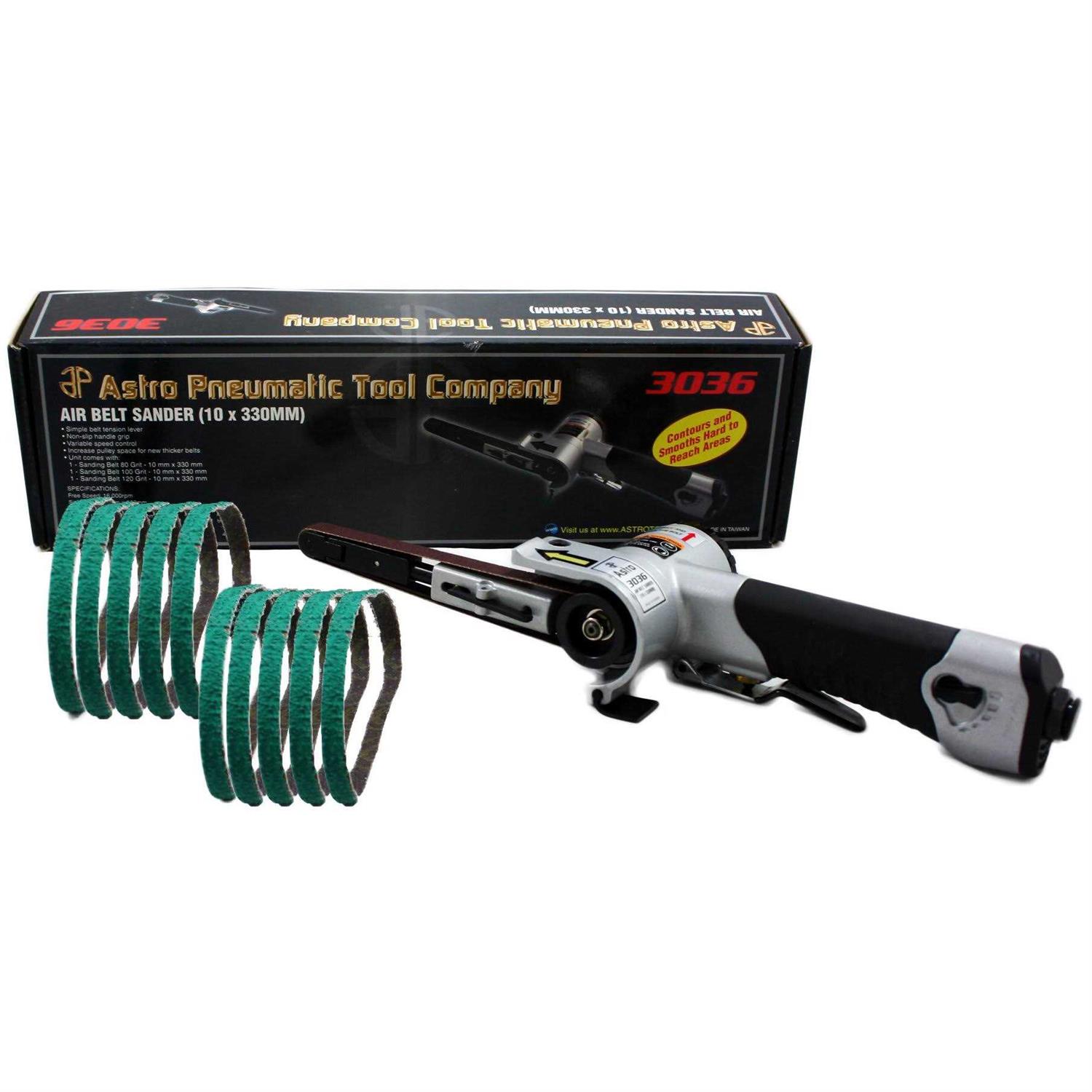 3036 astro pneumatic features and benefits simple belt tension lever. Non slip handle grip. Variable speed control. Increase pulley space for new thicker belts. Unit comes with: 1 sanding belt 80 grit 10mm x 330mm, 1 sanding belt 100 grit 10mm x 330mm, 1 sanding belt 120 grit 10mm x 330mm. Free speed: 16,000rpm. Size of belt: 10mm x 330mm. Average air consumption: 4cfm. Overall length: 12.59 (320mm). Net weight: 2.09lbs (0.95kg). Air inlet: 1/4. Air pressure: 90 psi.