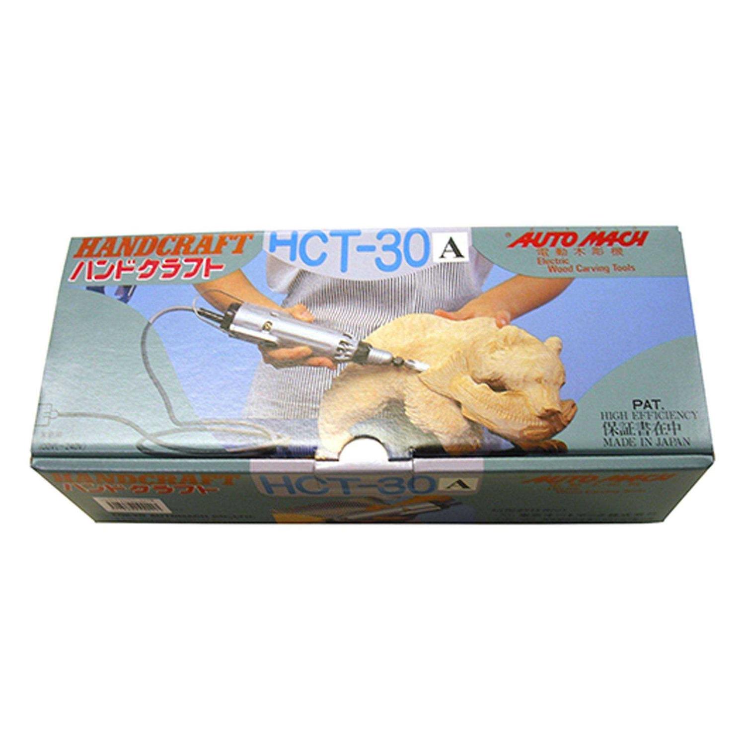 Model HCT 30A. The newest advancement in woodcarving technology! The Handcraft Carver is rugged and reliable. Aluminum die-cast body is light and vibration free. Special reciprocating action of the cutter head carves through the toughest woods with just simple hand direction. Greater pressure causes a deeper cut. For safety, free-floating action keeps blades motionless until pressed against wood. The laminated blades move at 10,000 vibrations per minute, leaving a smooth cut surface. Carvers appreciate the versatility in portability and movement, as well as accuracy and speed. A powerful 80-watt ball bearing motor delivers 10,000 vibrations per minute for 1mm cutting strokes. Includes 6′ grounded cord, rear on/off switch, hanger, five blades, two spanner wrenches, and complete instructions for use. Body measures 228mm (9 inch) long x 44mm (1-3/4 inch) diameter, 990 grams (2 lbs.) in weight. UL listed.