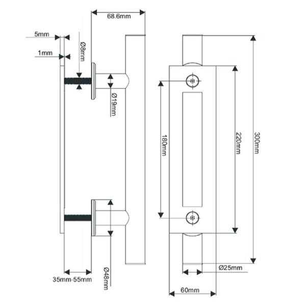 One side features a trendy bar pull, while the other side utilizes a functional recessed pull. All mounting hardware is included. Choose from Black, Oil Rubbed Bronze, Satin Nickel, or Stainless Steel.
