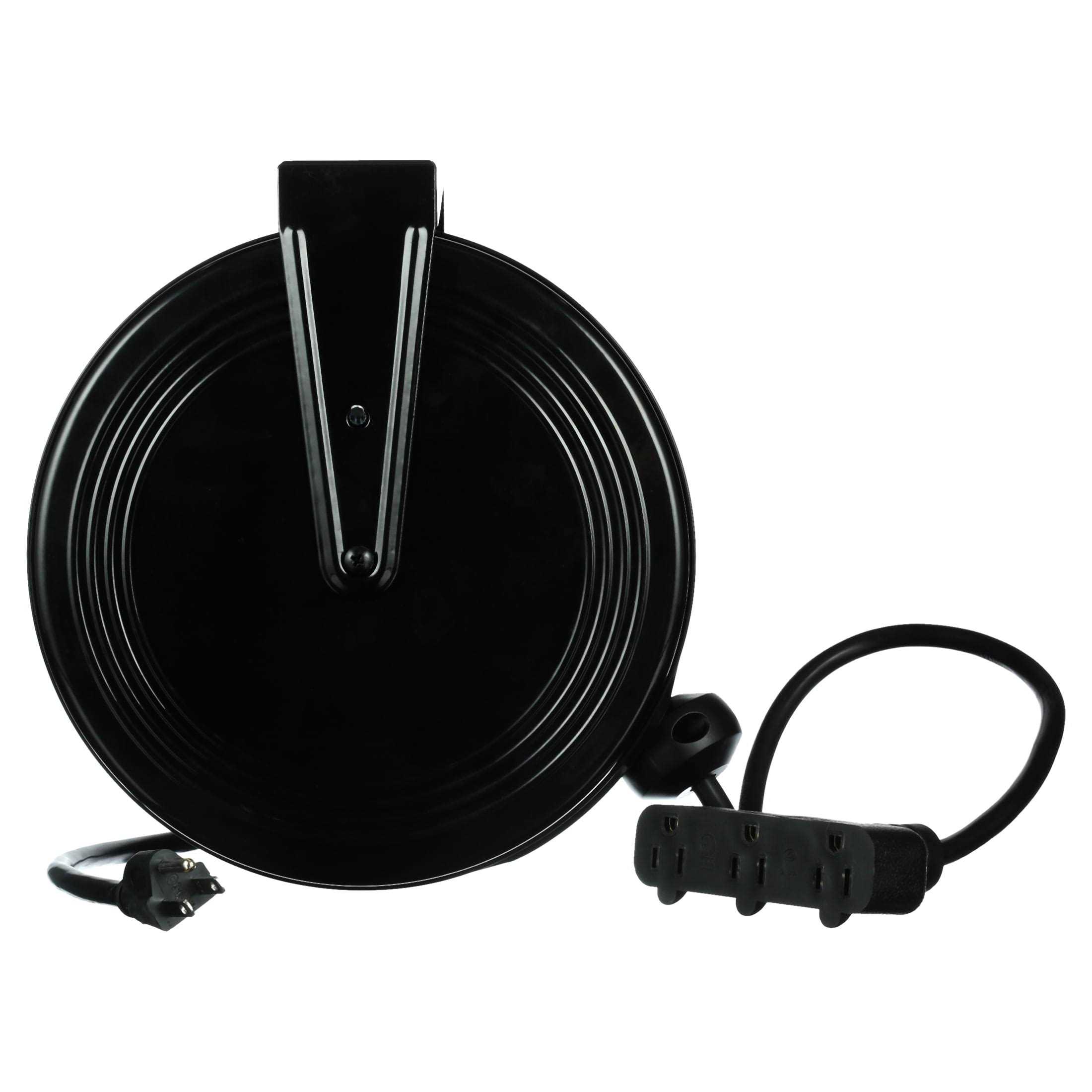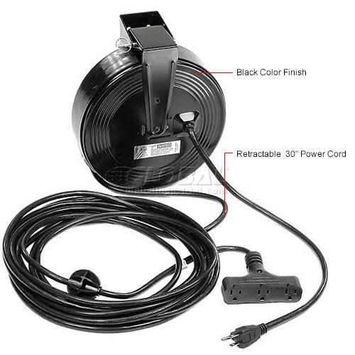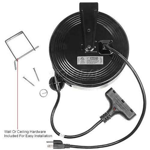 Don’t let your electrical cords overpower you! Keep them in order with this retractable cord reel from Bayco. Complete with a 30 ft. long 120Vac cord as well as a Triple Tap Connector this black light duty grade cord reel is a great pick. The temperature range is from 0 degrees to 150 degrees F. It operates at 9600 watts and a maximum of 13 amps. Equipped with 3 outlets operation is simple. It comes with a black cord. The overall dimensions are 17-1/2″ tall by 12-1/2″ wide by 16-1/2″ deep. Standards include: UL Csa.