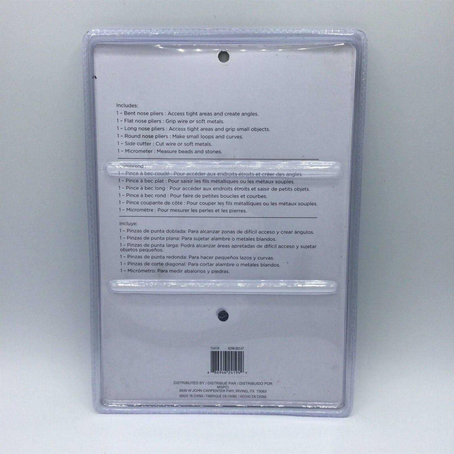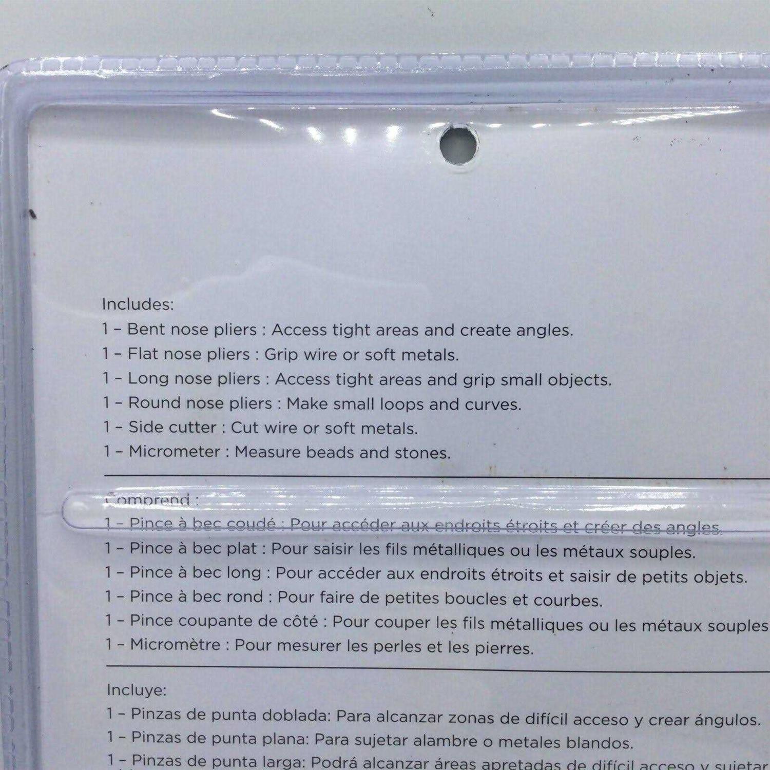 A must-have for the beginner or experienced jewelry maker, this complete tool set includes assorted pliers, side cutter and micrometer. A must-have for the beginner or experienced jewelry maker, this complete tool set includes all the tools you need to design your own creations. Use the assorted pliers, side cutter and micrometer provided to grip and cut wire, make loops, pick up small items, access tight areas and more. Details: Includes 6 pieces PVC handle Steel body Content: Flat nose pliers Bent nose pliers Long nose pliers Round nose pliers Side cutter Micrometer This set of jewelry making tools helps you create necklaces, rings, and more with accuracy, efficiency, and ease. Included are four different types of jewelry pliers, a side cutter and a micrometer, so you can grip and cut wire, make loops, and pick up small items. Whether you’re metalworking or beading, this set of jewelry making supplies makes working with intricate parts simple and fun.