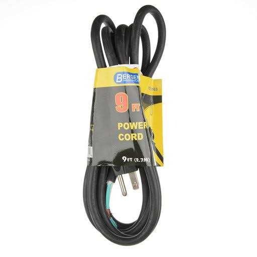 Bergen Industries Inc.s 9 Foot 3-Wire black replacement power cords are ideal for appliances, motors and power tools. Weve solved your power problems by allowing you to easily replace old cords as they become frayed, damaged, and unusable. Our cords are constructed with heavy-duty 14/3 AWG cable and are molded 15 Amp, allowing them to fit most of your power cord replacement needs.