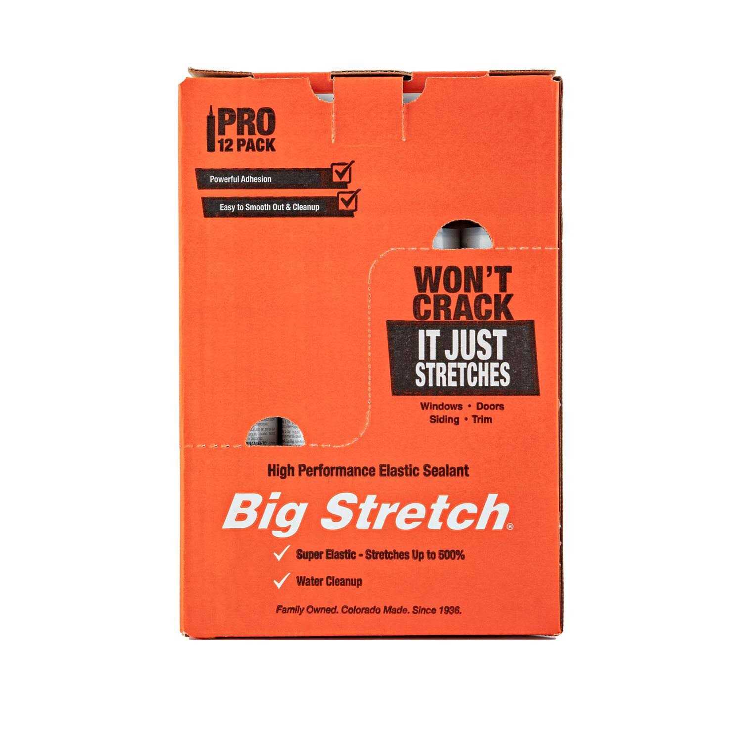 Big Stretch is a high-performance water-based elastomeric sealant with powerful adhesion and superior elasticity. It spans gaps up to 2 inches wide and stretches up to 500% of original joint size without cracking. Big Stretch wont crack it just stretches. Moves when your home moves to create a permanently waterproof and weatherproof seal. Helps you avoid repeated repairs. Just say no to brittle cracked caulking. Stays soft and elastic over time for a long-lasting seal. Sticks even to difficult surfaces. Compatible with a wide variety of building materials including difficult surfaces like vinyl windows and siding. No need to search for a product specific to every different surface. Professional looking results every time. The smooth formula is easy to apply even for a novice.