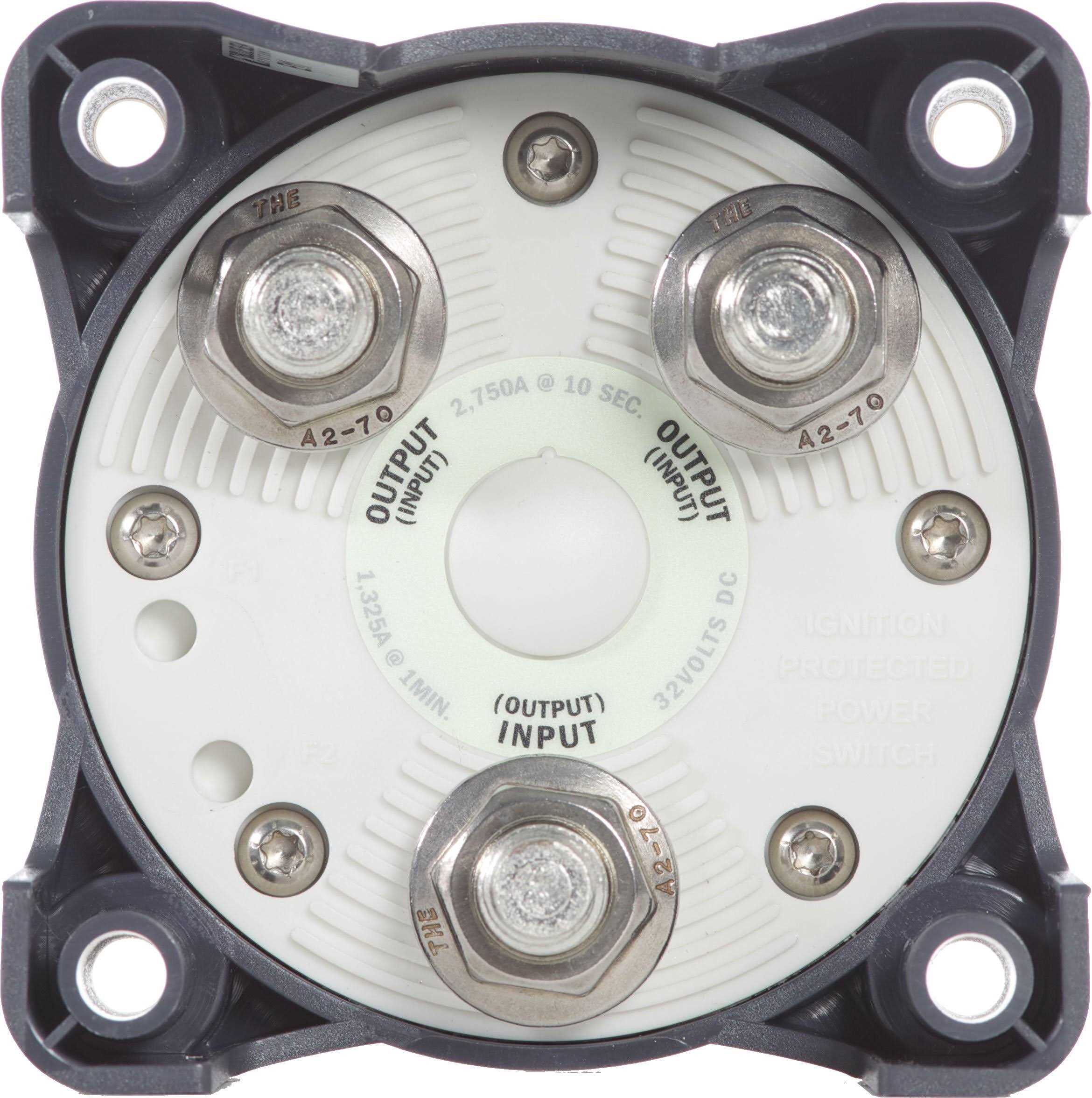 A compact battery switch capable of handling up to 600 Amps Blue Sea Systems heavy duty battery switches have a compact footprint, but carry incredible electrical loads. Built on the same chassis as the e-Series switches they can be easily installed in a variety of locations. The Heavy-Duty series are ignition protected and can be located in the engine rooms of gasoline powered boats. A make before break feature allows switching between banks without interrupting current flow. The tactile texture of the switch face and knob allow operation by feel in low or no light situations. One piece tin-plated copper terminal studs are long enough to accept multiple cables and will accept the torque required to create a secure connection that minimizes resistance. The Heavy Duty series switches are designed to carry high loads and fit in small places.