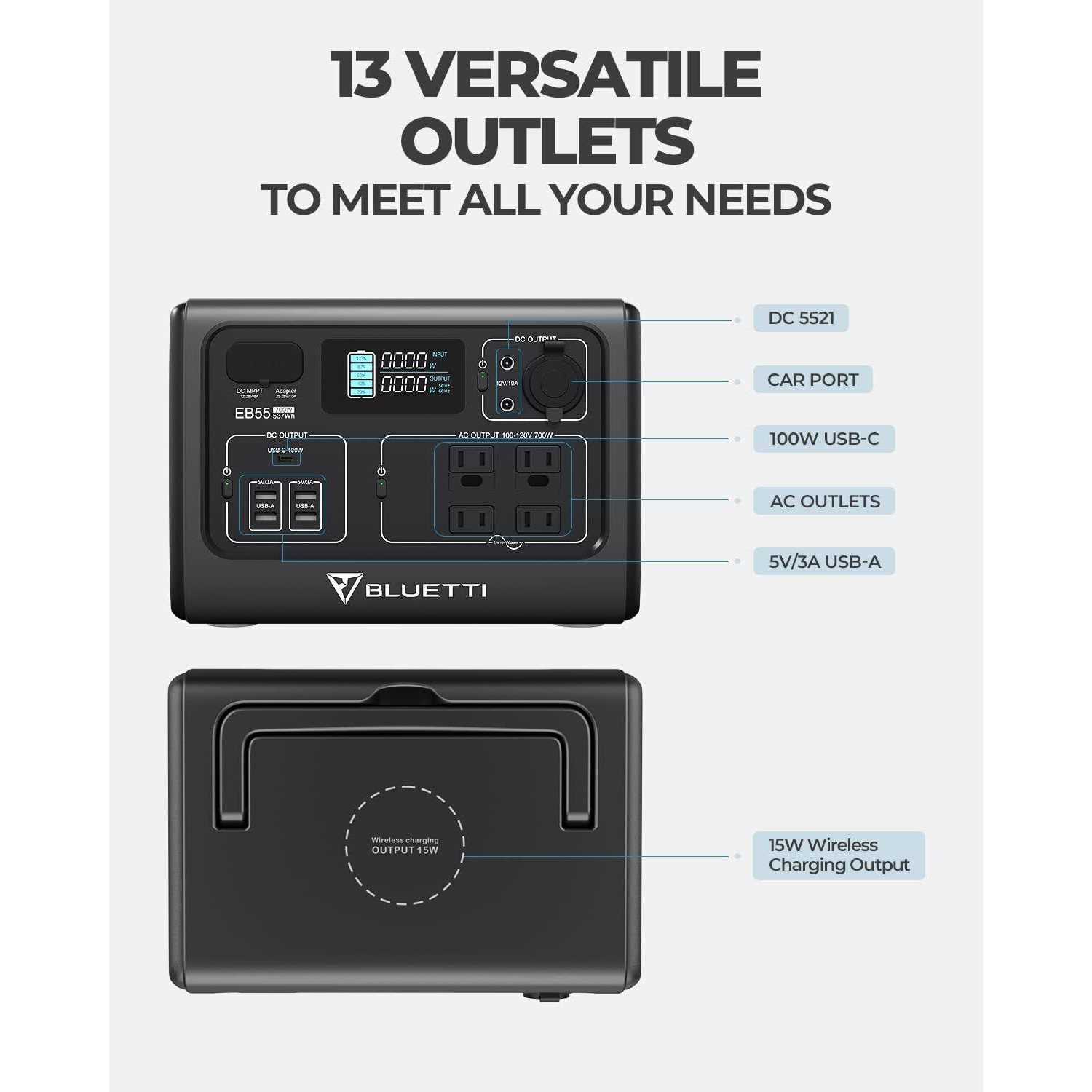 Bluetti EB55 Portable Power Station Highlights: 700W AC Pure Sine Wave Inverter (1,400W Surge) 537Wh Capacity LiFePO4 Battery with 2,500+ Life Cycles to 80% 13 Outputs For Multiple Devices 6 Ways to Recharge (AC/Solar/Car/Generator/AC+Solar/Dual AC) 200W Max. Solar Input 400W Max. Fast Dual Charging (Solar + AC Adapter Simultaneously) Eco-friendly/Gas free/Quiet/Cost-effective Description: Meet all your need during camping The compact and lightweight design makes the BLUETTI EB55 a Portable Power Station, perfect to use in a campervan, or on a camping trip. With capacity of 537Wh and built-in 700W (surge 1400W) strong inverter, EB55 could run most of your essential outdoor appliances and electronics such as mobile phones, mini freezers, radios, projectors and more. Multiple DC & AC Outputs, Versatile Recharging EB55 could run 13 devices simultaneously. From smartphone, to mini-fridge, you can power all your electronics with it. Especially, there are one piece of wireless charging pad. An ideal solution for outdoor trip EB55 power station wights 16.5Lbs. With a handle, you can take it anywhere you want to go. A small energy solution with big performance. Get Charged In Anyway You Prefer EB55 power station supports 4 ways to recharge, including wall outlet, generator, car outlet, solar panels. Along with a reliable PV panel, it’s a fantastic way to support you during your camping. Incomparable Outlet Versatility The EB55 is easy to carry, recharges quickly, and performed flawlessly with your drones, phones, laptop, astronomical telescopes.