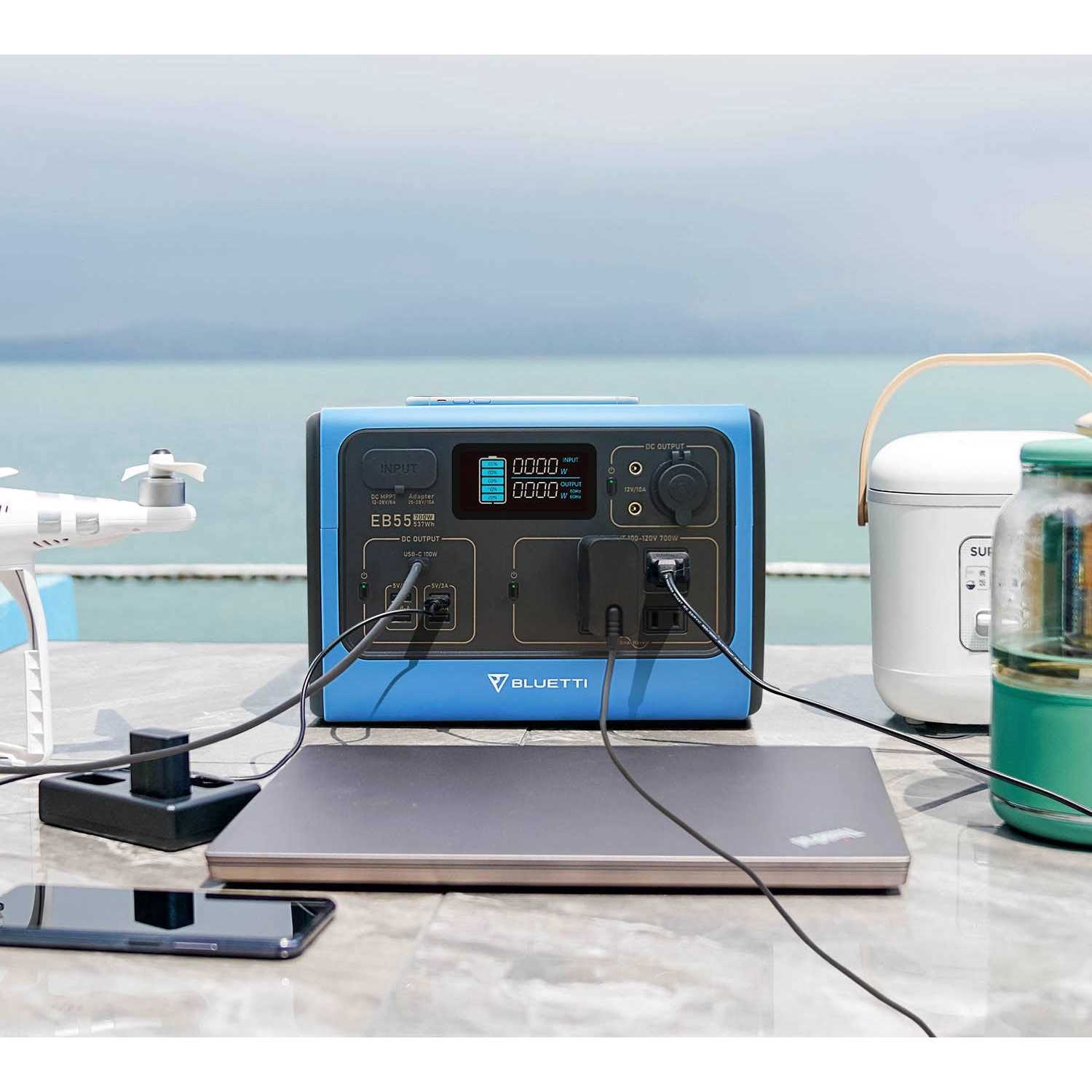 This BLUETTI EB55 Solar Power Station with a compact and lightweight design and with a capacity of 537Wh and the power of 700W can be used at home or in a camping trip; It can run most of your essential outdoor appliances and electronics such as mobile phones, cameras, Bluetooth speakers, radios and more.