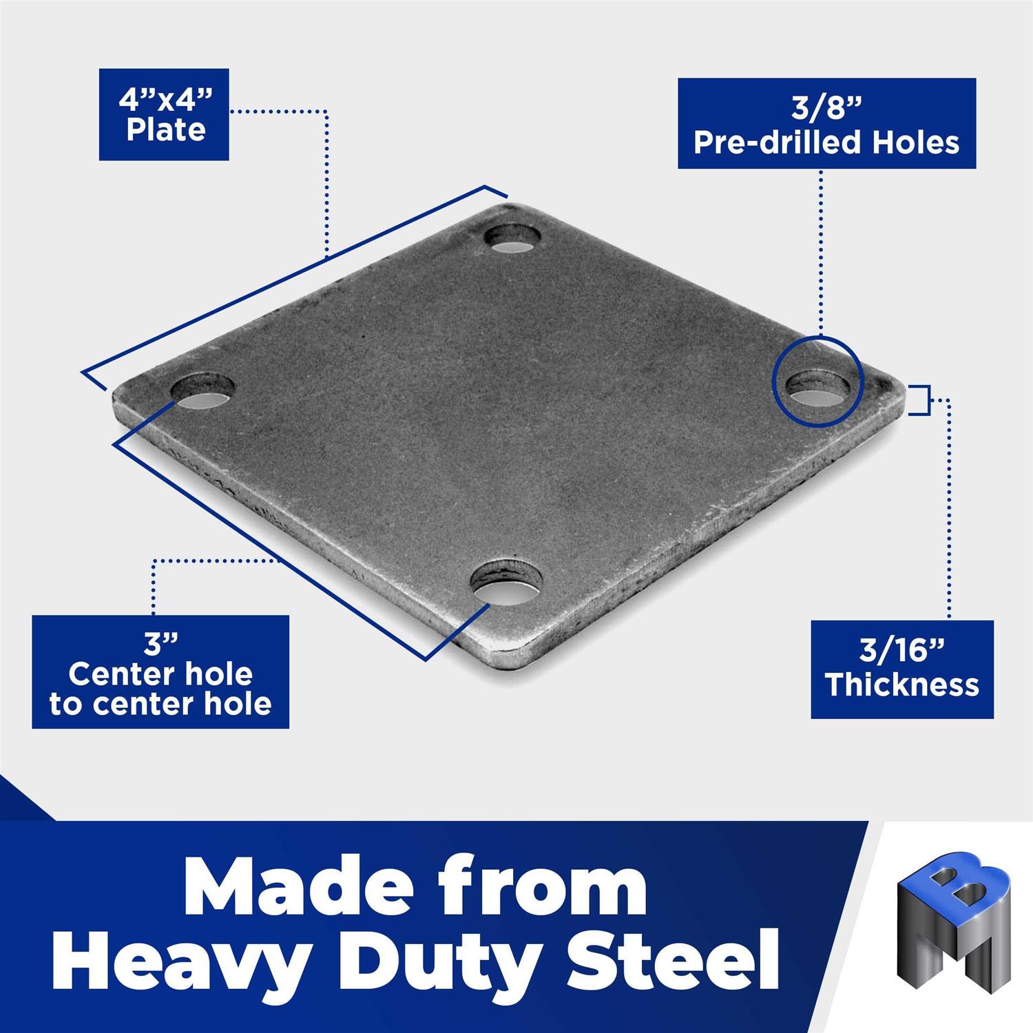 This sturdy steel plate provides stable anchor to posts and structures on brick, concrete or cinder block surfaces. The metal plate is hot-rolled and made of A36 steel, the same standard-grade alloy used in the construction of buildings. With a wide range of general and industrial applications, this steel plate supports structures subject to heavy vibration. The steel base may also be used as a mount for permanently installed equipment. Each metal plate has a smooth, stained gray finish that provides an ideal base for painting. This allows for an even, wear-resistant top coat that prevents paint from peeling or chipping. Each plate measures 4 X 4 and is 3/16 thick. Holes are pre-drilled on all 4 corners, with each hole measuring 3/8 in diameter. Additional holes may be added to the plate using a heavy-duty, hard drill bit.