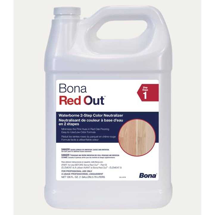 Minimizes the red/pink hues commonly found in red oak flooring Parts 1 & 2 Simple, easy-to-use 2-step process Compatible with the entire Bona Finishing System Quick drying, low odor formula No limited pot life and no wasted product Bona Red Out is a simple, easy-to-use solution to remove red and pink hues commonly found in red oak flooring and other wood species with red tones. Bona Red Out is a two-step waterborne color neutralizer designed to reduce red and pink tones to help mimic the look of white oak wood flooring. Bona Red Out is safe to use on multiple wood species from red oak to Brazilian cherry. This unique product is very low odor, dries quickly, and is compatible with the entire Bona System to allow easy preparation for staining, sealing, and finishing, making it the perfect first step to achieve lighter tones including a nordic look no matter the color or species of wood. Bona Red Out is safe for all residential and commercial flooring surfaces where a lighter, natural style is preferred. Because it is a waterborne product, there is also no need to water pop the floor prior to staining, saving valuable time. There is no pot life with Bona Red Out so there is minimal waste and it can be used across multiple jobs. Plus, the product can be diluted with water for easy customization to fit any project needs.