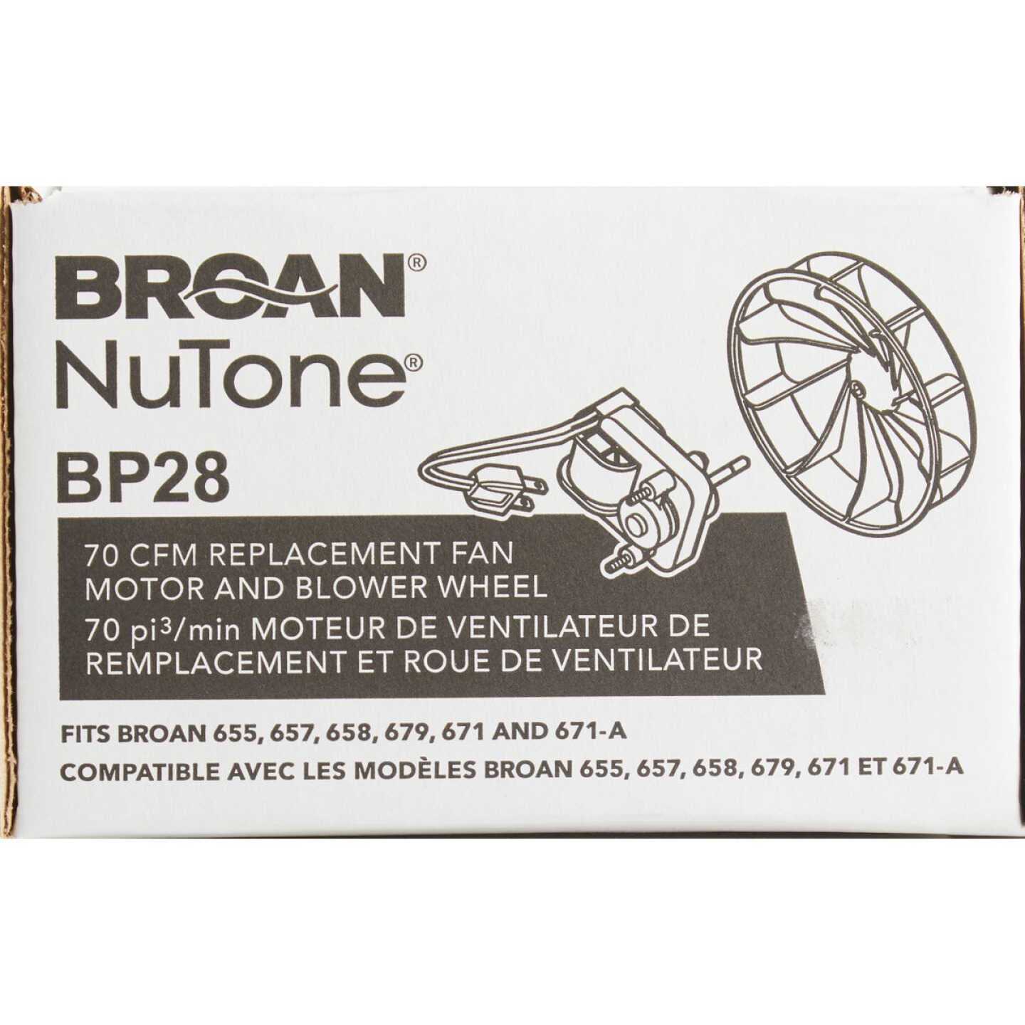The Broan BP28 is a motor/wheel. This Broan BP28 motor/wheel can blow air up to 70 CFM. It maximizes the ventilation performance in your bathroom and kitchen. This product is compatible with the Broan 655, 657, 658, 679, 671, and 671-A fans.