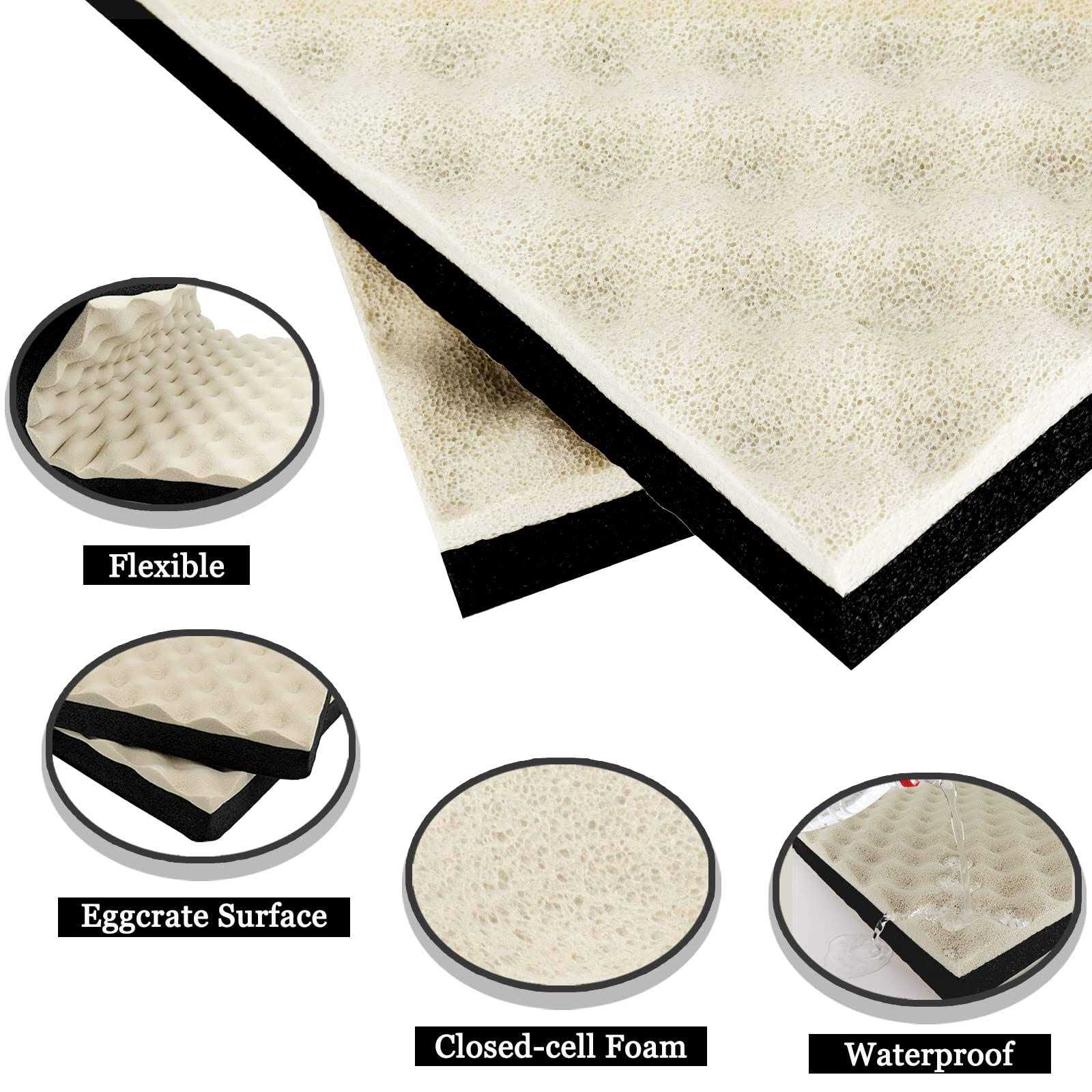 Its material is closed cell foam and its surface is eggcrate pattern, so it can better block & reduce noise. Meanwhile, it’s also an excellent sound absorbing material that helps absorb sound energy, cancel reverb, and remove echoes or reflections 【THERMAL INSULATION】: Dense thicker closed cell foam has a higher R-value than open cell foam, thus can better at keeping heat in or out of a structure. It also acts as a vapor barrier, water and moisture will be less likely to get inside the home, and the foam itself is unharmed by water damage 【ENDLESS-APPLICATION】: This wall foam panel is flexible, and great decoration on walls, perfect for home studio, HVAC, ceiling, door, music room, office, pet house etc. 【EASY INSTALLATION】: This sound barrier has strong self-adhesive backing, and is easy to cut for diy. It’s flexible, waterproof, and super light, can be used no matter indoors or outdoors BXI Sound Proof Foam Panels Features NOISE REDUCTION Dense & thick closed cell foam material can better muffle & dampen sound. And it is the best choice for robust insulating where space is an issue. SOUND ABSORPTION Egg crate surface helps absorb sound energy, reduce reverb, and removeechoesor reflections. THERMAL INSULATION 1.8 inches thick closed cell foam can better at keeping heat in or out of a structure. It can also act as a vapor barrier, so water and moisture will be less likely to get inside the home, and the foam itself is unharmed by water damage. Keypoints for Soundproofing 1. The soundproof foam needs to completely cover the noise source because noise can easily go through gaps. 2. For bass noise made by machines, please firstly put some anti vibration pads under the machines . 3. For doors/ windows/ walls/ceiling soundproofing, please firstly use acoustic sealant to seal all the cracks and gaps on/between them. Easy to Install with Self-adhesive Backing: 1. Open package (no decompression) 2. Clean the wall surface 3. Peel off the paper on the back 4. Stick to the wall surface foam tiles soundproof acoustic panel studio foam acoustical wall panels soundproof door soundproofing panels soundproof blanket for door soundproofing for doors sound proofing padding for door foam wall panels sound proof door cover soundproof floor window inserts soundproof