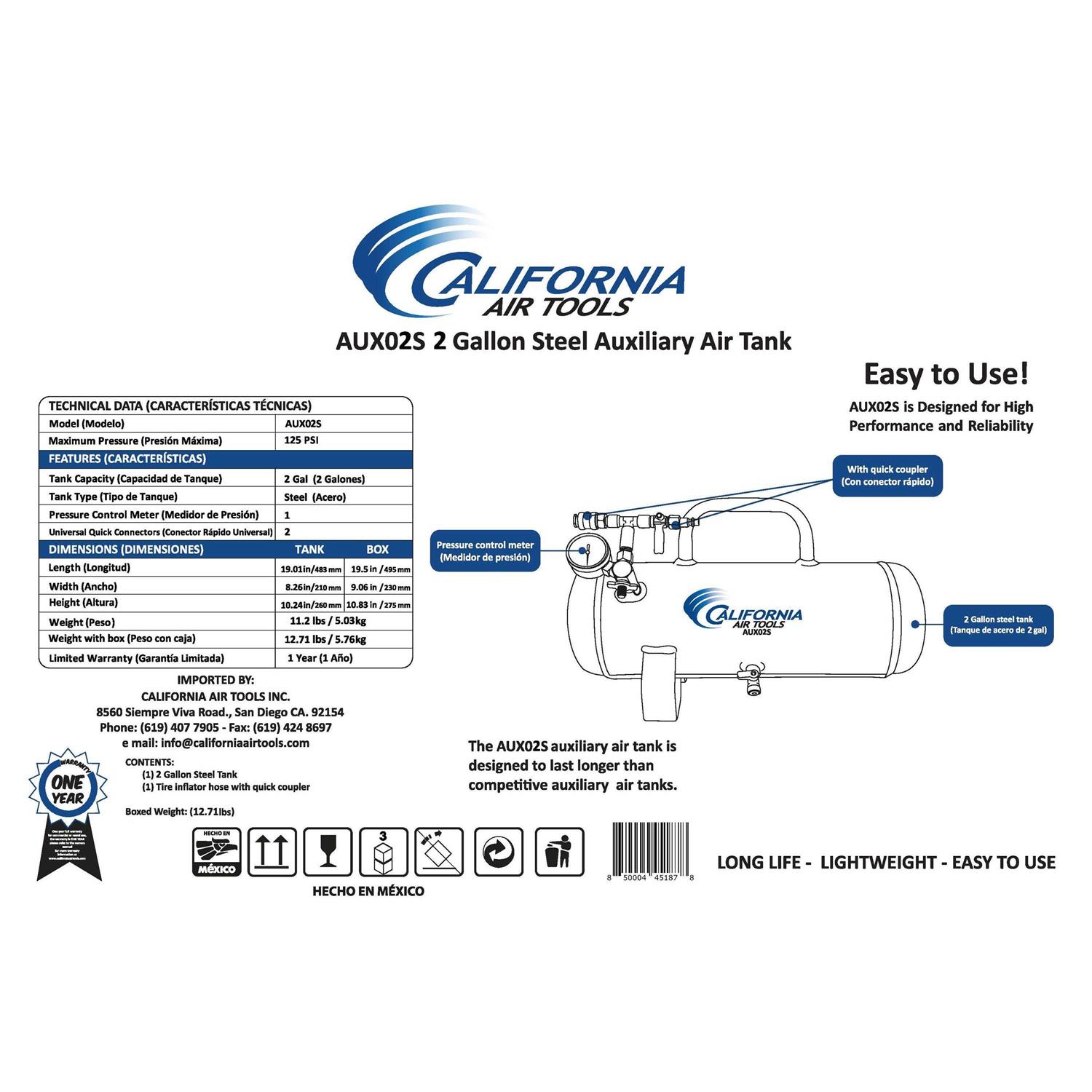 California Air Tools AUX02S – 2 Gallon Steel Auxiliary Air Tank is designed for portability and ease of use. The lightweight and easy carry designs make transporting this air tank very easy. California Air Tools auxiliary air tanks are designed to provide an extra supply of air needed for short-term demands such as inflating tires. These auxiliary air tanks provide stable pressure and a constant air flow for purposes such as spray painting. Having the California Air Tools auxiliary air tanks will allow you to have an extra supply of air for more time before the air compressor motor/pump starts to run. The Easy to Use Industrial Quick Connect Fittings on the Air Hose and Air Valve allows you to quickly attach the Air Hose to an air compressor and fill the auxiliary air tank without needing extra air fittings. This Easy to Use Quick Connect System also allows you to connect a standard air hose to your air valve for use with air tools.