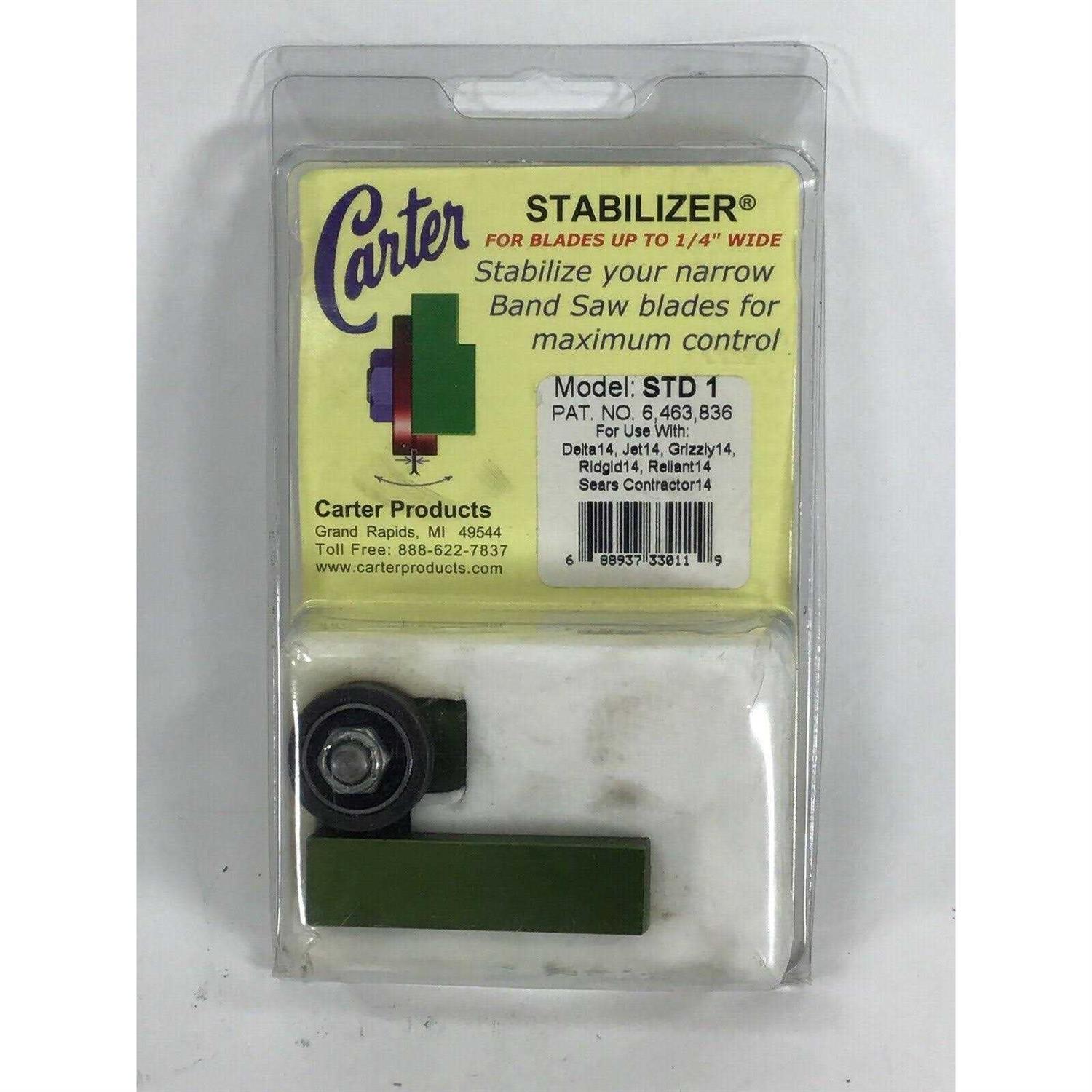 The unique patented Stabilizer , STD1, from Carter is very different from any traditional guide in that it is not designed to hold the blade with immovable support on three sides. Instead, its grooved bearing wheel firmly prevents the blade from moving backwards or shifting left or right while still permitting the front of the blade to twist slightly side to side. This allows the user to make tight radius complex curves that no traditional guide system can achieve.STD1 -Fits most stock OEM guides with block configuration. Fits Delta 14″, Jet 14″, Rigid 14″, Reliant 14″, Sears Contractor 14″, Grizzly 14″, Porter-Cable 14″, Central Machine 14″, Powermatic 14″ and other similar cast iron framed 14″saws using friction blocks.