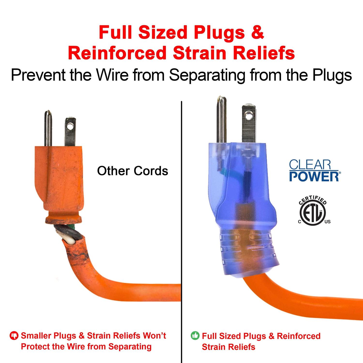 This Clear Power CP11118 outdoor 100 foot extension cord is water & weather resistant, flame retardant and made to work. It is ideal for use with power tools, appliances and other devices rated up to 10 amps. The strain-reliefs are oversized to prevent the wire from separating from the plug and connector. This outdoor extension cord has a built-in power indicator light to show when there is power running through the cord. 10A/125V/1250W