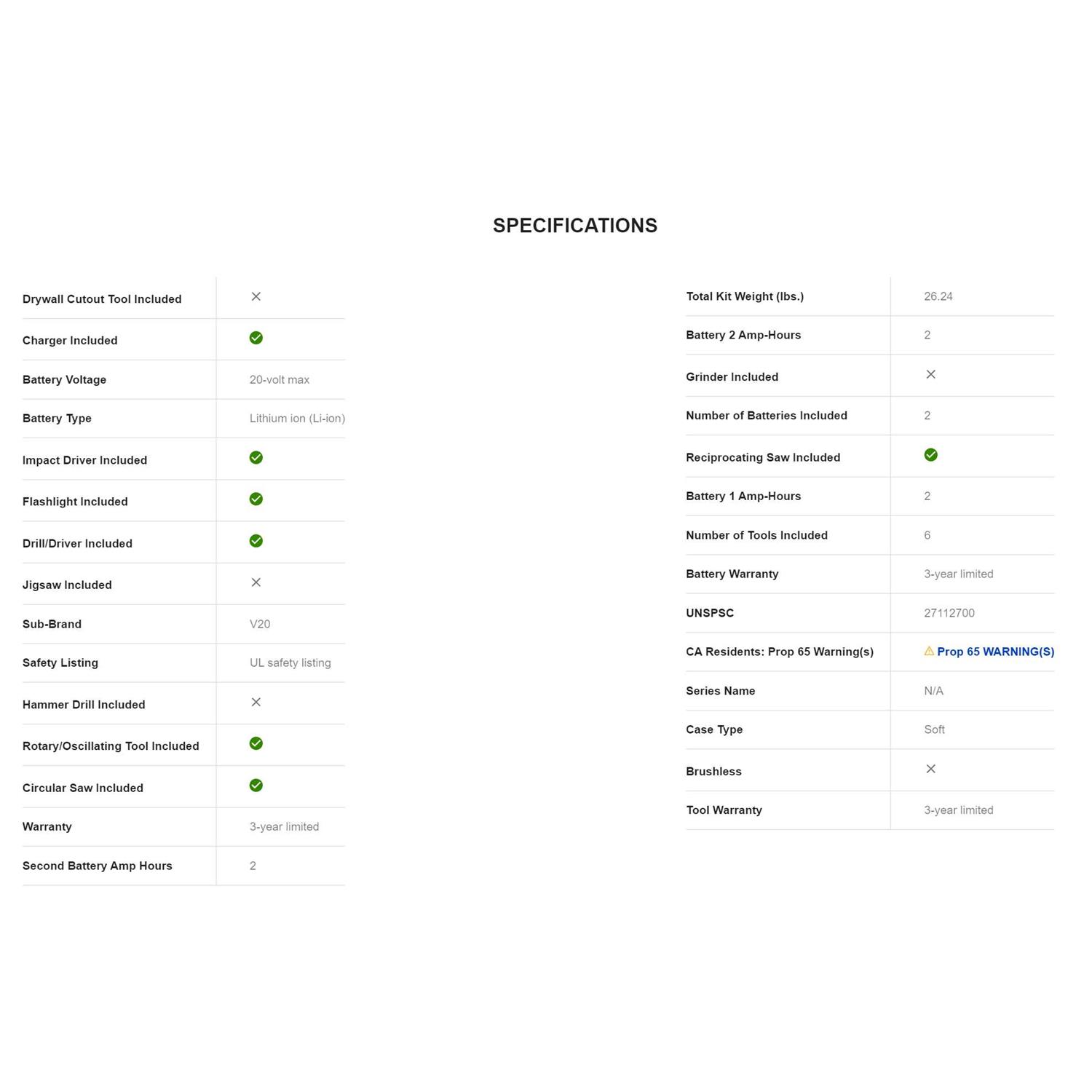 Tackle almost any drilling, fastening, and cutting project with this multi-utility V20* Cordless 6-Tool Combo Kit. Made for the professional, the kit comes with 2 batteries and a charger, equipping you with what you need to handle a full day’s work. For convenience, a soft storage bag is also included so you can easily transport and store the tools, batteries, charger, and accessories between jobs.
