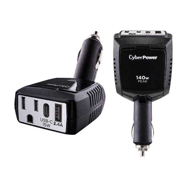 The CyberPower M140BUC 140 Watt Power Inverter converts power from your vehicle’s 12V DC power outlet into household AC power. The M140BUC can simultaneously power one device through its standard AC outlet, and charge up to two devices with its one, 2.4 amp USB-A port, and one 15 watt USB-C port. The M140BUC features a pivoting DC plug to accommodate tight spacing in some cars, a 15 amp fuse for overcurrent protection, and automatic power shutdown that will prevent your automotive battery from excessive power drain. The CyberPower M140BUC’s AC output is rated at 120 watts continuous power, and up to 140 watts of peak power for operation of small electronics that draw a low amount of power.