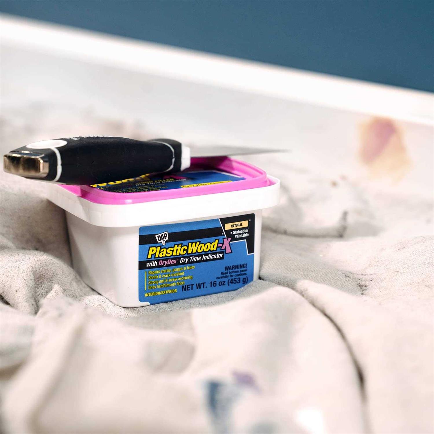 Plastic Wood-X All Purpose Wood Filler with DryDex Dry Time Indicator goes on pink and dries to a natural, wood finish, so you know when it’s ready to sand! This patented technology eliminates the guesswork and reduces the chance of errors. Its ready-to-use, thick knife-grade formula spreads easily for fast, professional repairs and can be applied on vertical surfaces. Ideal for filling nail holes, gouges, cracks, scratches and imperfections on any wood surface. It’s stainable, paintable and won’t shrink crack or crumble. It can be sanded, planed, cut, drilled, screwed or nailed.