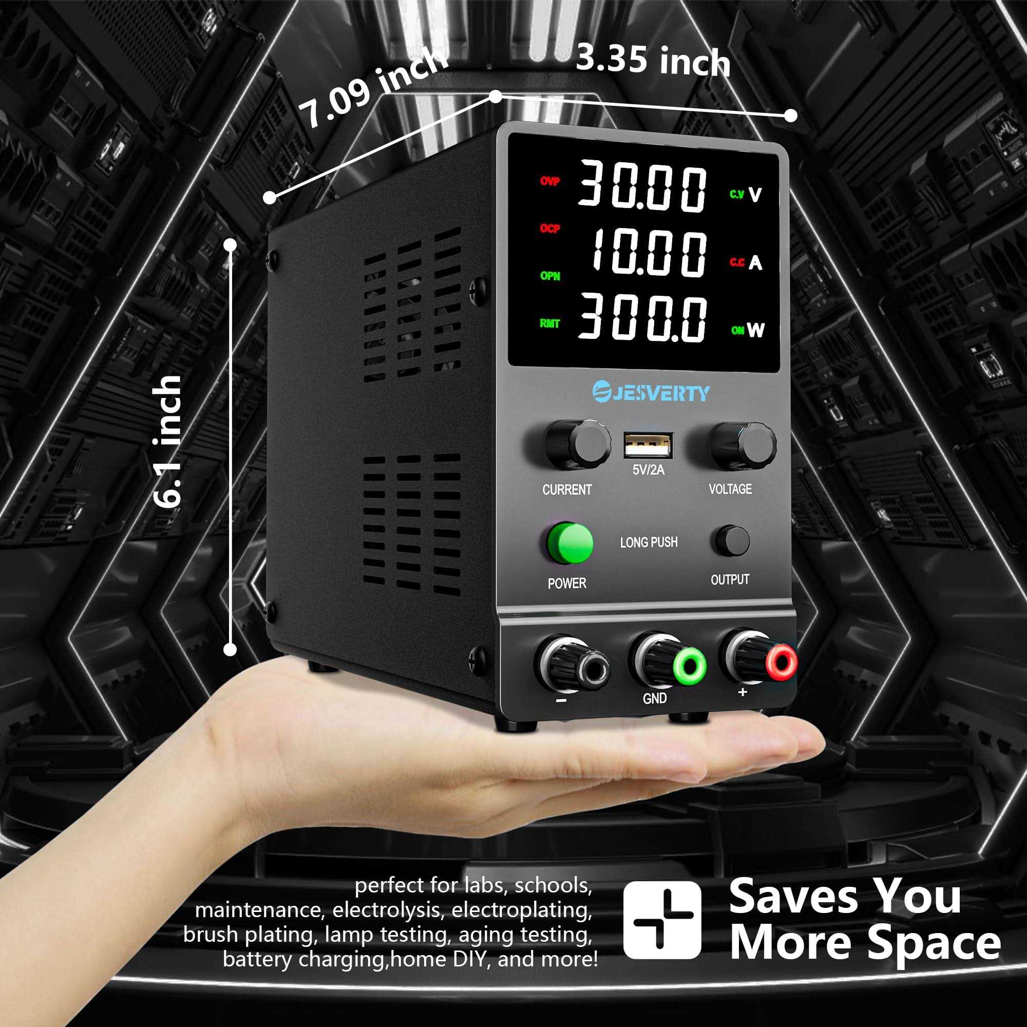 Jesverty DC Power Supply Variable, 0-30v 0-10A Adjustable Switching DC Regulated Bench Power Supply with Encoder Knob, Output On/Off Switch, 4-Digit