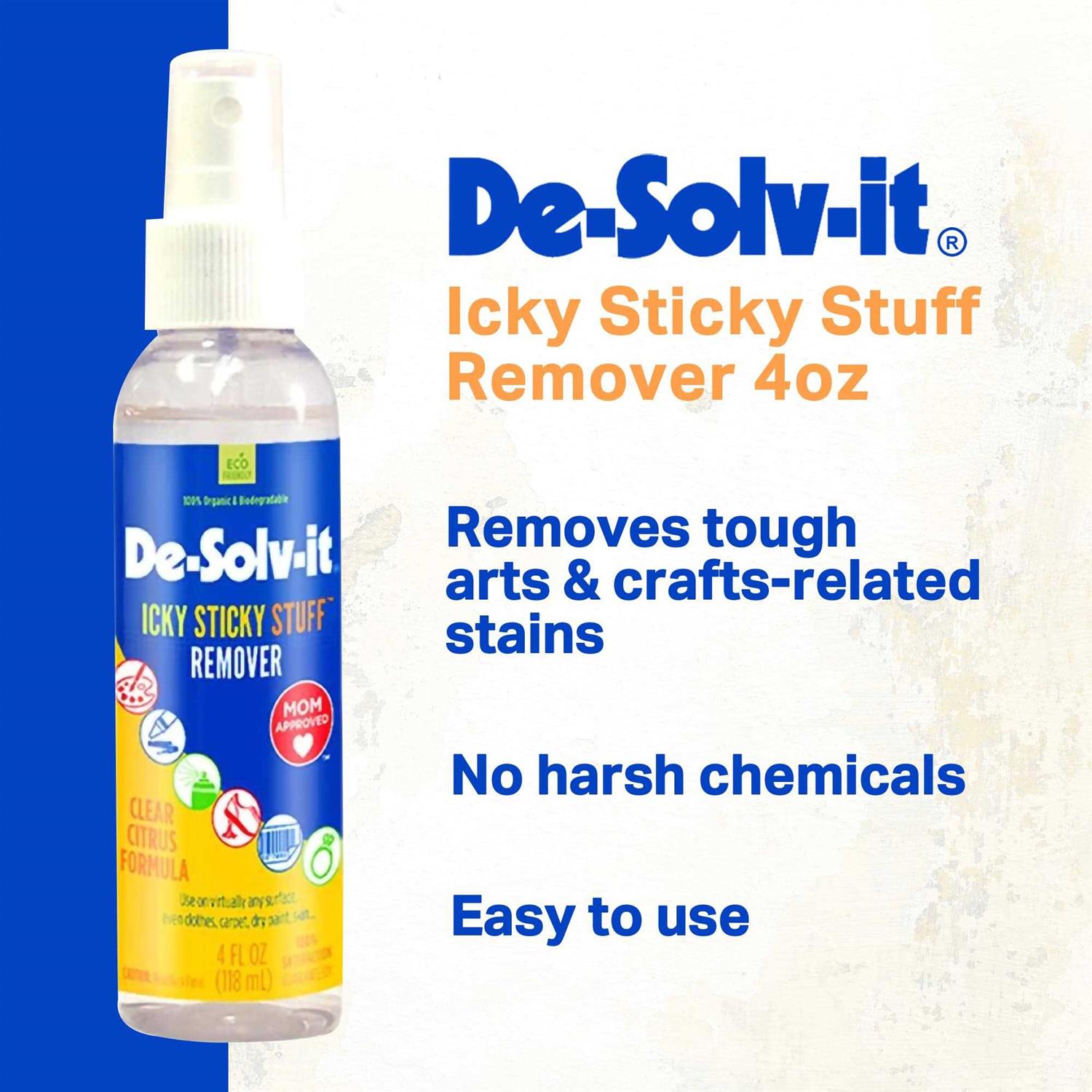 De-Solv-it Icky Sticky Stuff Remover: Easily removes all sorts of arts & crafts related residue & stuff! De-Solv-It Icky Sticky Stuff Remover is an easy-to-use remover that targets arts and crafts related residue like crayon markings, fresh oil paint, sculpting clay, and more. Its organic and non-toxic formula is gentle on surfaces, even on hair and skin. It also offers versatile application, and can be used to get rid of tape adhesive, decals, grease, hot melt glue, tar, inks, etc.