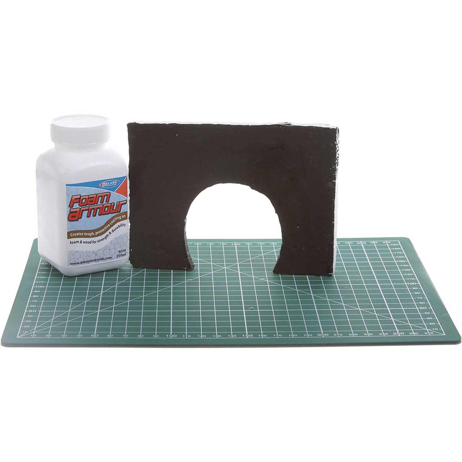 Deluxe Materials BD50 Foam Armour – For Protecting Foam & Wood Creates a hard durable surface layer on foam and wood. Ideal for scenics, model aircraft etc. A thick water based resin that sets to produce an attractive, durable, scratch resistant coating on foam to prevent dings, wear and disintegration. It dries to a surface that can be painted and glued easily and will reduce damage. Easy to apply. Seals surfaces, gaps and foam edges to prevent disintegration. Can be over-coated or mixed with acrylic paint. Is easily glued and worked. Bonds electrostatic grass and scatter materials as it dries. 250g pot covers 0.7 sqm / 7sqft.