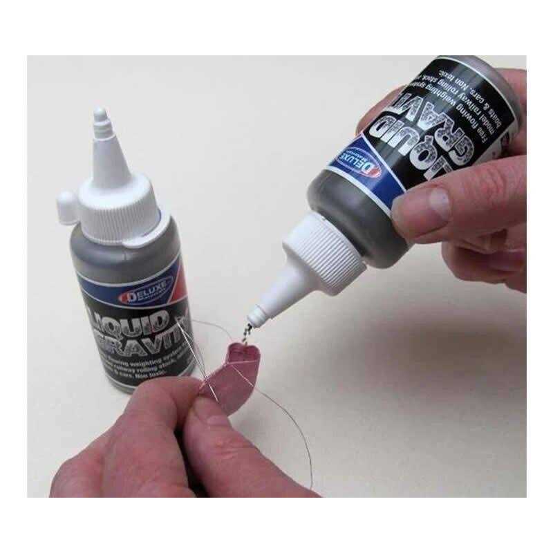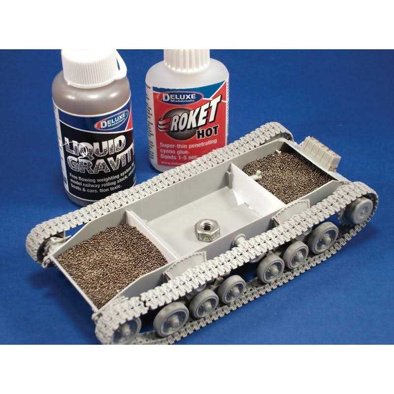 Deluxe Materials Liquid Gravity is a non-toxic, easy flowing, weighting system for scale military models, railway rolling stock, model planes, boats, radio control cars, trucks and more. Liquid Gravity is essentially tiny beads or balls, that are weighted. Specially designed to pour into small cavities and set in place with your favorite Rocket Cyano (DLMAD43-46), Speed Epoxy or thin CA.