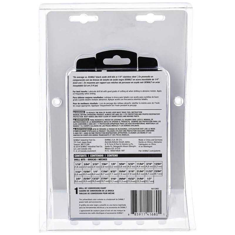 The DEWALT 29 Piece Pilot Point Drill Bit Set features a pilot point and split tip design that starts on contact and eliminates bit walking along for more control. Designed for maximum speed and life in stainless steel and other hard metals. Commonly used for drilling into stainless steel, drilling into angle iron, I-Beams, and other similar metals.