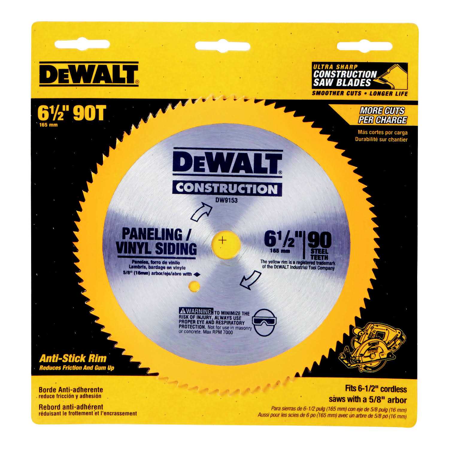 Featuring tungsten carbide teeth for maximum durability and a thin kerf for fast, smooth cuts, DeWALT small diameter construction saw blades power through a variety of building materials with ease. Ribbed heat vents allow blades to run at cooler temperatures, reducing blade flexing and binding. Anti-stick coating minimizes friction and gum up. Tougher tungsten carbide stays sharper longer. Tougher tungsten carbide stays sharper longer. Thin kerf design results in faster cutting and less drag. All blades feature 5/8 in arbor with diamond knockout. Specially formulated anti-stick coating minimizes friction and gum up for smoother cuts. Ribbed heat vents allow blade to run cooler, reducing blade flexing and binding.
