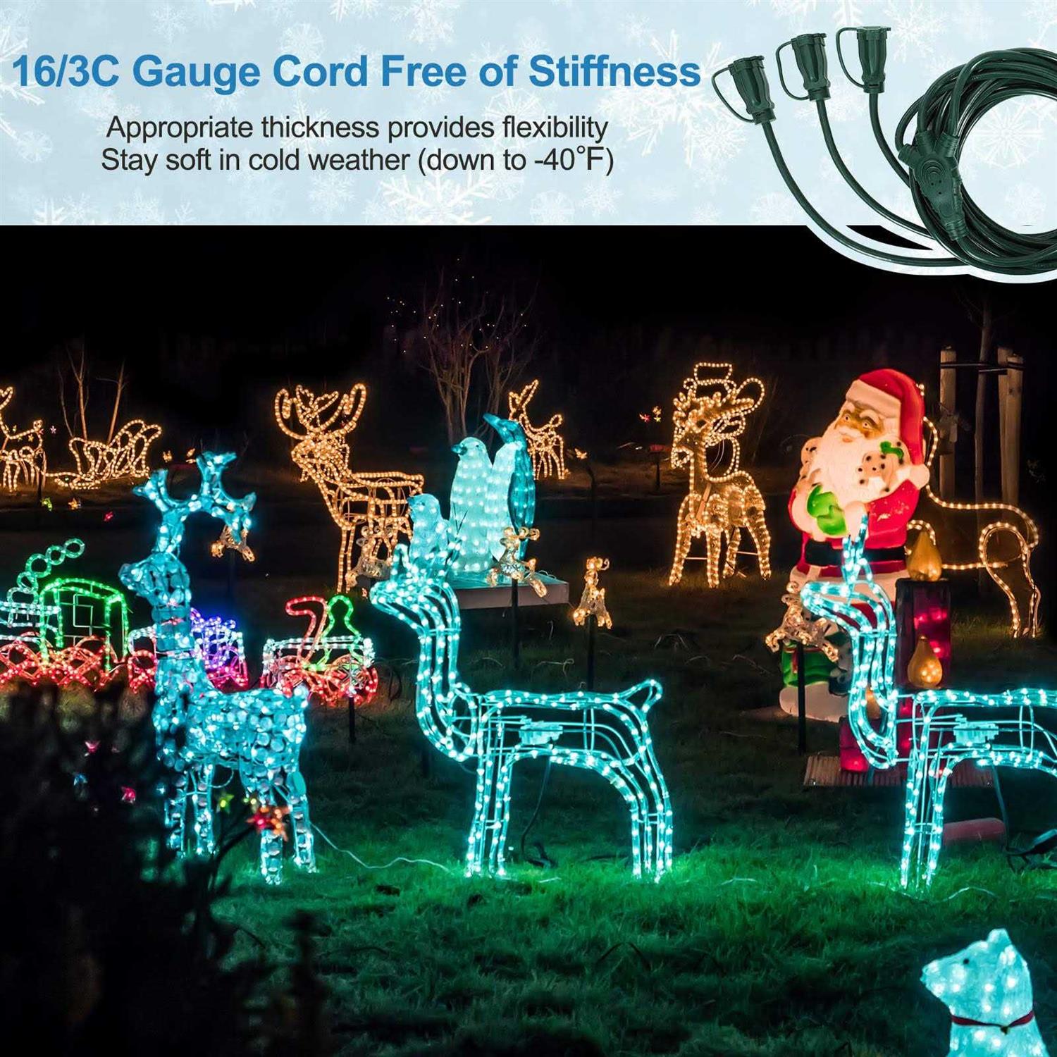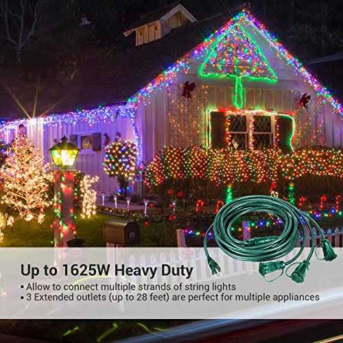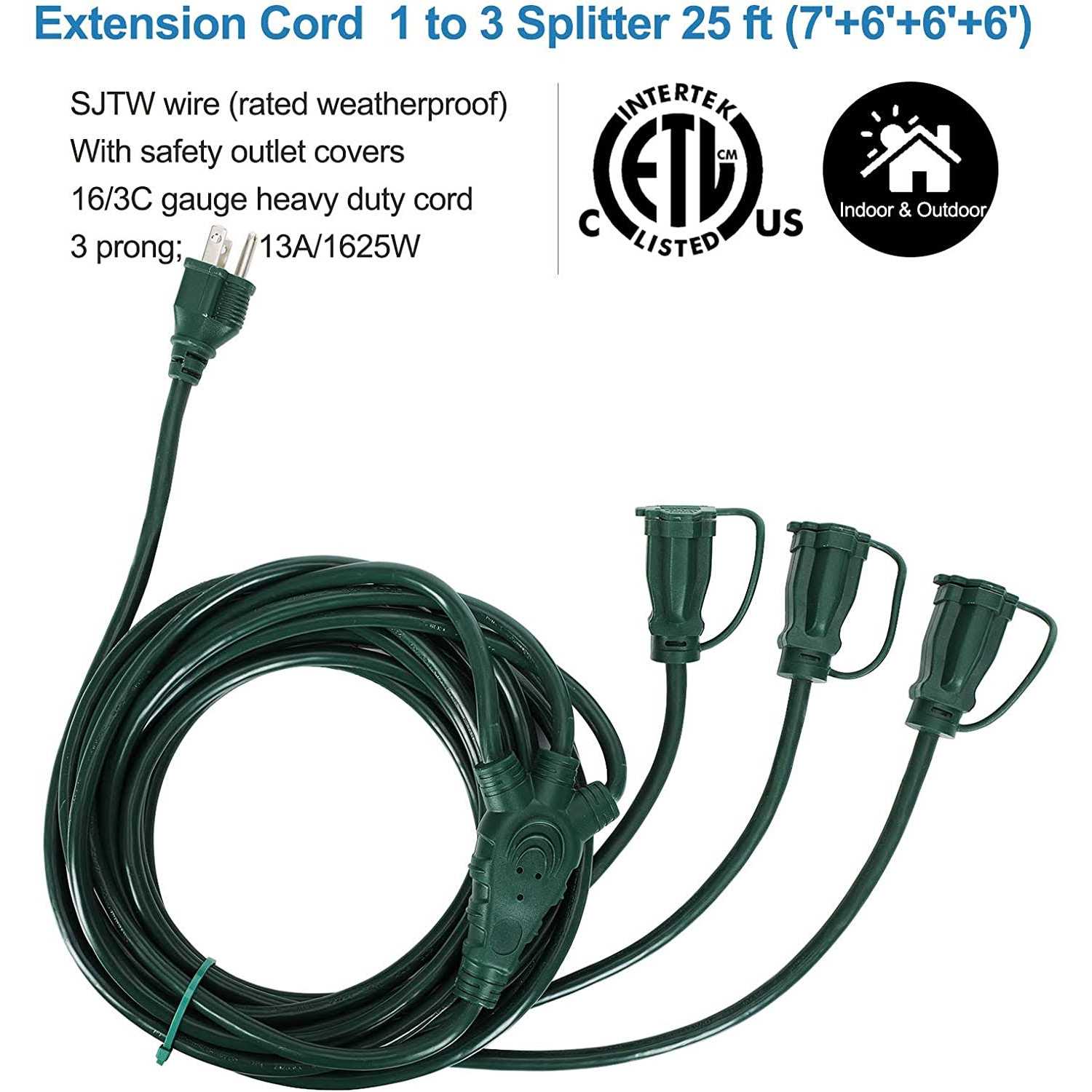 Dewenwils 3 Outlets Outdoor Multi-Directional 16/3C Extension Power Cord, 25 Feet 1 to 3 Splitter Perfect Solution for Landscaping Lights and Christmas Displays Expanding 1 wall socket into 3 extended outlets (up to 13 feet each one), this 25 ft total length (7’+6’+6’+6′) extension cord is easy to connect multiple decorations in one single location. Green jacket blends in with lawn, gardens and Christmas trees without distracting from your outdoor decor. Allowing you to use less cords, it can eliminate cord chaos caused by all kinds of extension cables, and keep your patio organized and clutter free. Ideal for setting up multi strands of string lights, holiday decorations, stake lights; Very useful for summer patio lighting and Christmas lights as well as plugging in other devices when you need to run an extension cord to get power somewhere for multiple things. “SJTW” Wire Type (Rated Weatherproof) Different from ordinary extension cords, this 3 prong extension cord is built with “SJTW” wire. Coated in wear resistant PVC outer jacket and having 3 conductors, this power outlet splitter is extremely tough and can resist tearing, abrasion, moisture and exposure to sunlight. Safety cover added on each outlet avoids water penetration. For both indoor & outdoor use (Note: Make sure the connections are not immersed in water). Strong and Reliable Power Cord – Safety Guaranteed! Certified to ETL, made of durable 16AWG heavy duty extension cables and 3-prong grounded plug, this multi plug extension cord allows you to connect multiple electrical devices. Safety designed for anywhere – Built to last forever! Specifications: Input Voltage: 125VAC Max.Current: 13A Max.Power Rating: 1625W Length: 25 Feet (7’+6’+6’+6′) Cord: SJTW 16 AWG /3C Packing List: 25 Feet 3 Outlets Outdoor Extension Cord Splitter