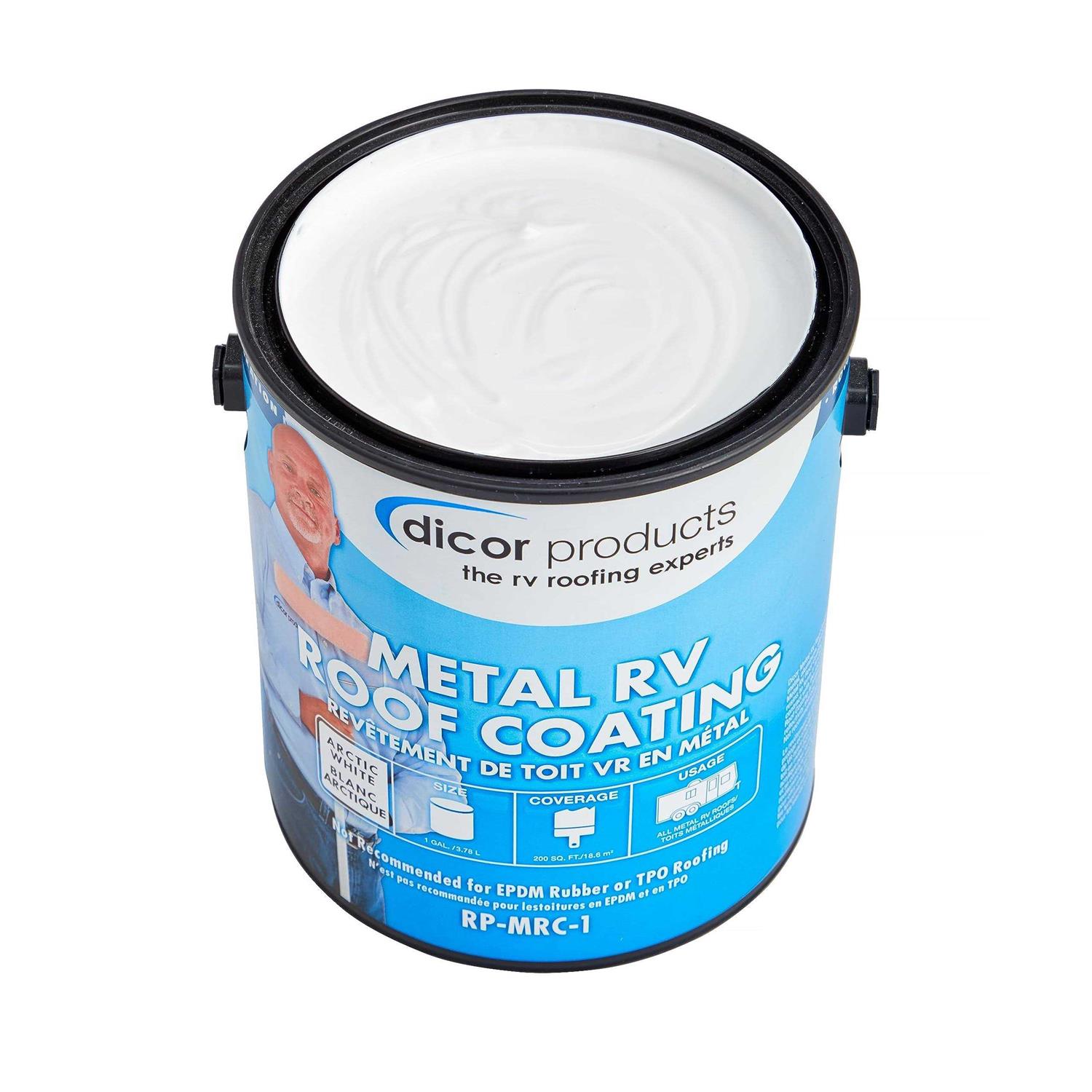 Dicor’s Metal RV Roof Coating, forms a rubber-like blanket of protectioin. The 100% Acrylic Resin is super bright white and helps keep interiors cooler. The dry paint film resists mildew and algae, is easy to apply and requires only soap and water to clean up.For use on metal RV roofing Dicor Elastomeric RV Roof Coating protects and beautifies metal, aluminum, steel and previously coated RV roofs. Dicor Elastomeric RV Roof Coating is formulated with 100% Acrylic Elastomeric resins to form a rubber-like coating that will expand and contract with movement of the roof. Arctic White RV Elastomeric is brilliant white to provide superior reflectivity, thereby lowering interior temperatures. Requies two coats for adequate protection at an application rate of 1 gallon per 200 sq. ft. per coat.