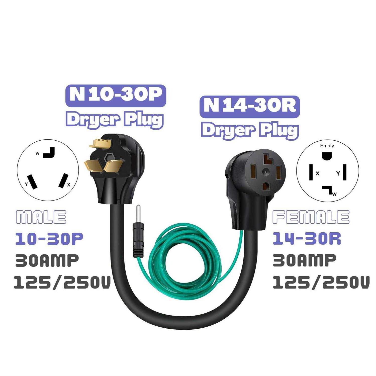 Dryer Adapter Cord NEMA 10-30P Male to 14-30R Female with Ground Wire 4-Prong to 3-Prong