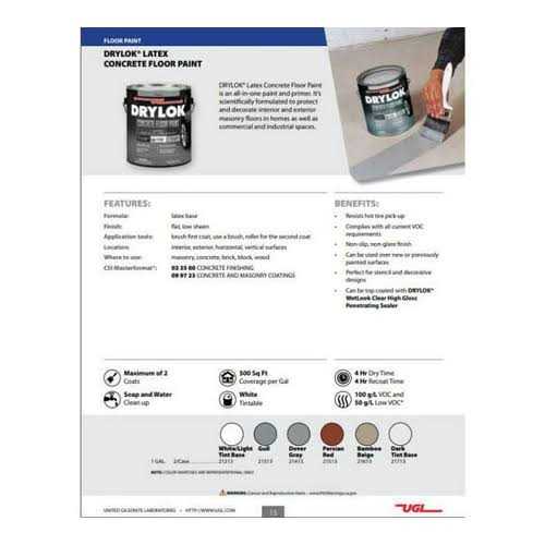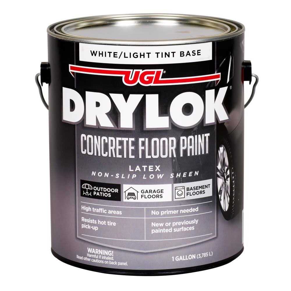 DRYLOK Concrete Floor Paint is specially formulated to protect and beautify interior and exterior masonry floors garage floors patios sidewalks concrete steps and wooden surfaces and trim in homes and industries. Perfect for decorative concrete stenciling. DRYLOK Concrete Floor Paint outperforms ordinary floor paint under traffic washings weather acids and alkalis. No primer needed Can be used over previously painted surfaces Non-slip low sheen finish Resists “hot tire pick up” Fast drying Get creative with stenciling Latex basesoap and water clean up 1 gallon covers 500-600 sq.ft. Additional discounts apply for this item when purchased as Bulk.