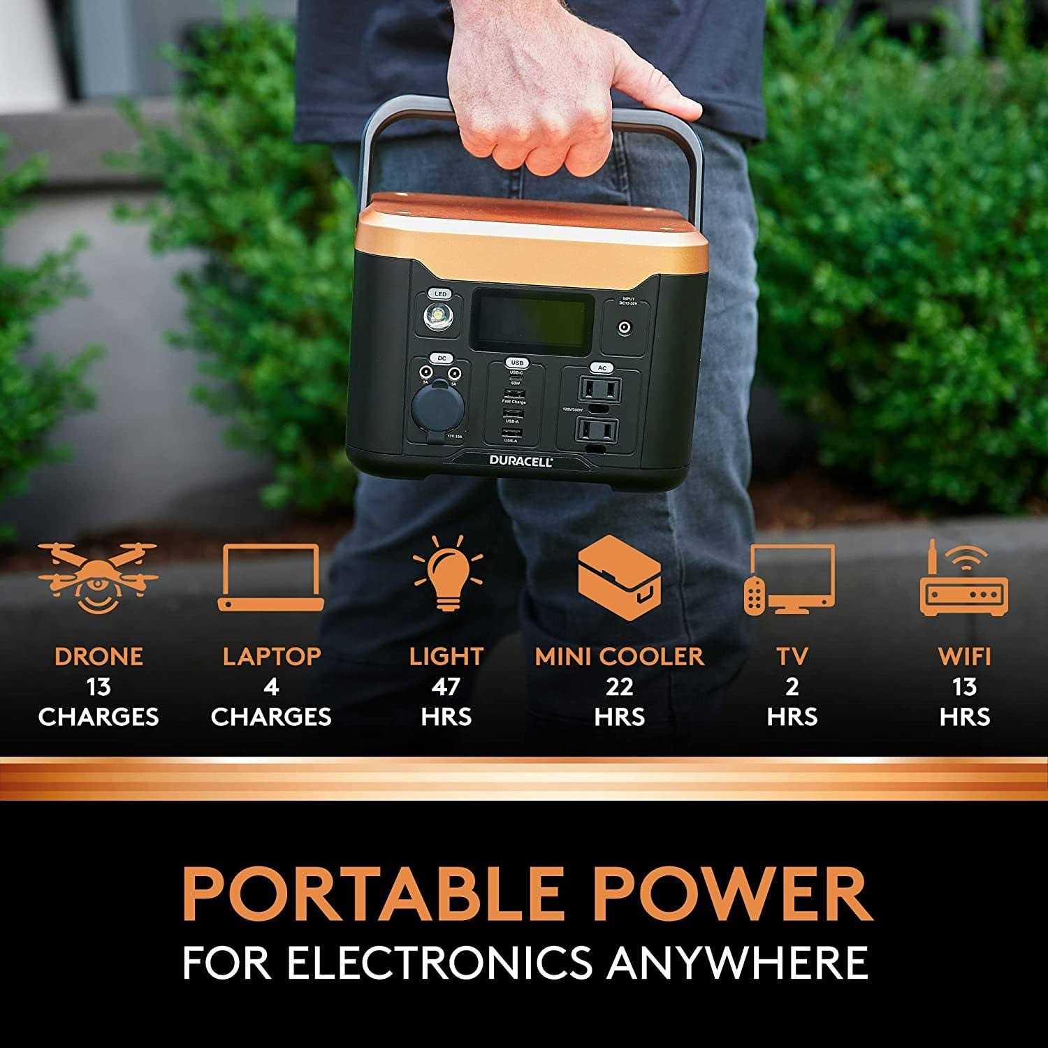RELIABLE POWER THAT LASTS: Power your critical devices for hours at a time. The Power 300 provides safety, comfort, and convenience during power outages. Use it to power laptops, mobile devices, or any small electronics that make your life easier. This power station provides 4 full charges of a laptop, 47 hours of light, 2 hours of TV, and 13 hours of wifi. QUICK AND FLEXIBLE RECHARGING: In addition to using a wall outlet, you can recharge the power station using solar panels (sold separately), or car lighter ports, giving you the reassurance that you will be able to charge your power station during longer power outages. EASY TO CARRY: At 7.5 pounds, this device is easily portable. Move it in and around the house or take it with you on the go. Dimensions: 8.5 by 6.2 by 6.3 inches. POWER MULTIPLE DEVICES AT ONCE: Multiple ports allows you to power devices simultaneously. GREEN POWER SUPPLY: This power station is compatible with the Duracell 100W Solar Panel (sold separately).