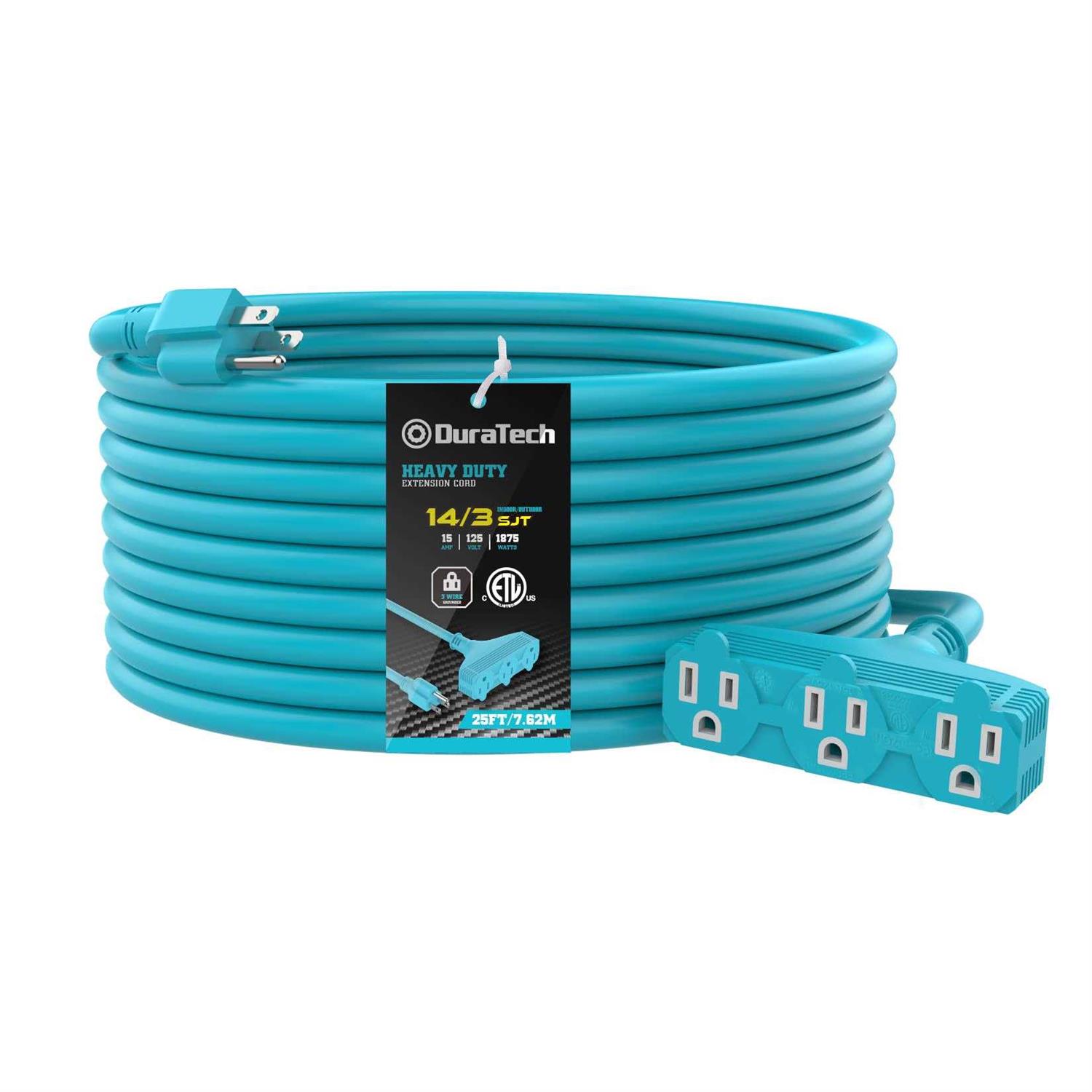 DuraTech Extension Cord 25 ft, Outdoor Extension Cord with 3 Outlets, 14/3 SJT, 15 Amps, 3 Prong Plug, Heavy Duty Extension Cord Power Strip, Blue