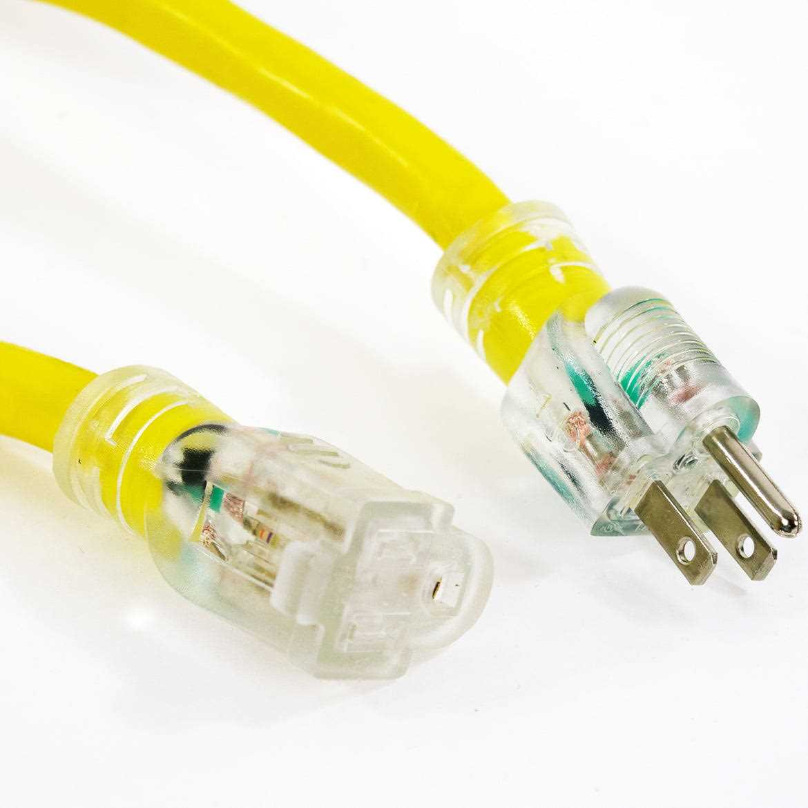 Features heavy-duty DuroMax Power Cord is Outdoor rated for safe use on the jobsite or in the yard or home project. The Bright Yellow Jacket allows for high visibility to help prevent accidental cutting and damage. Reinforced blades minimize the bending of prongs and reduce breakage. Lighted ends allow the user to confirm when power is supplied to the cord. Heavy-duty PVC jacket resists moisture, abrasion, and temperature. Grounded plugs allow for safe operation.