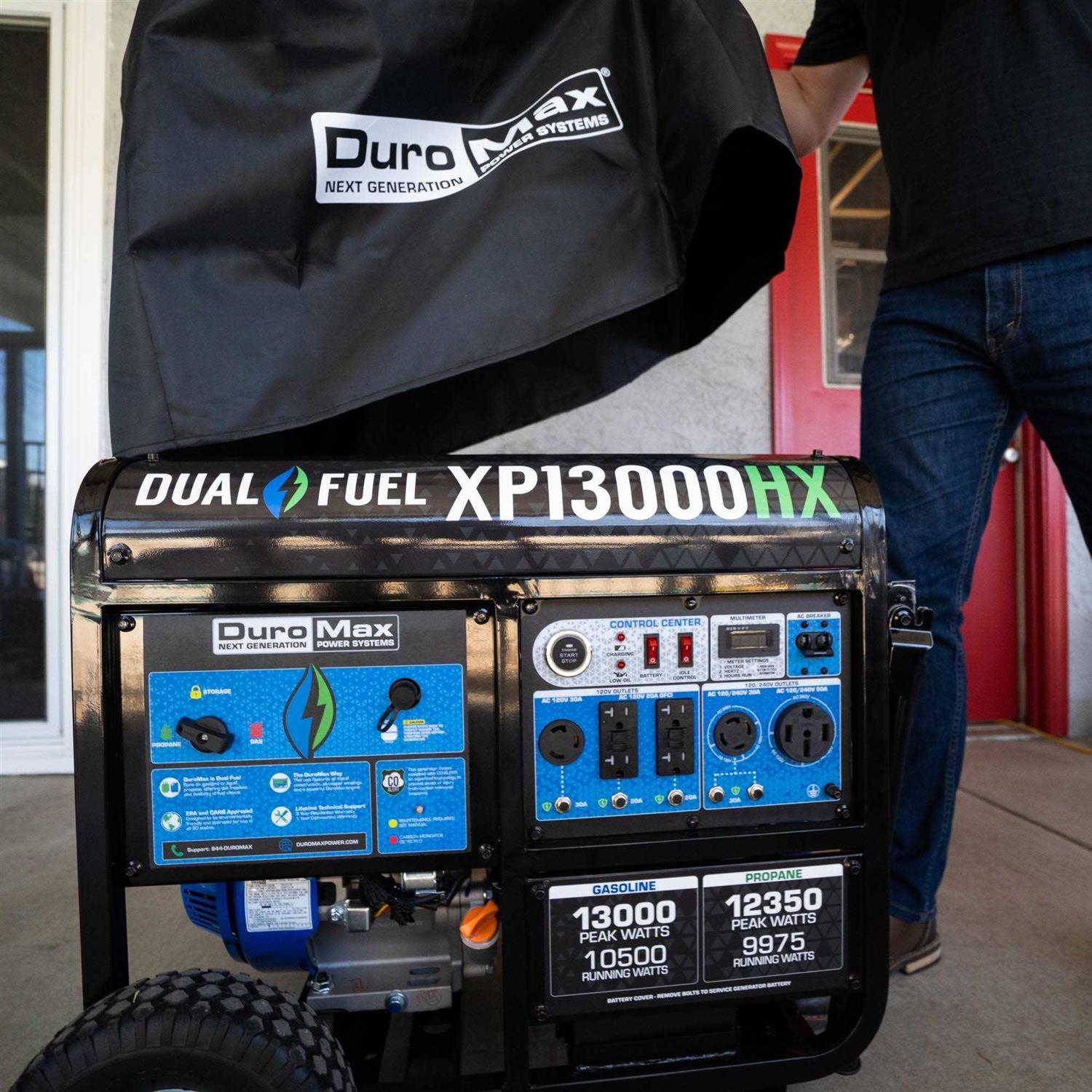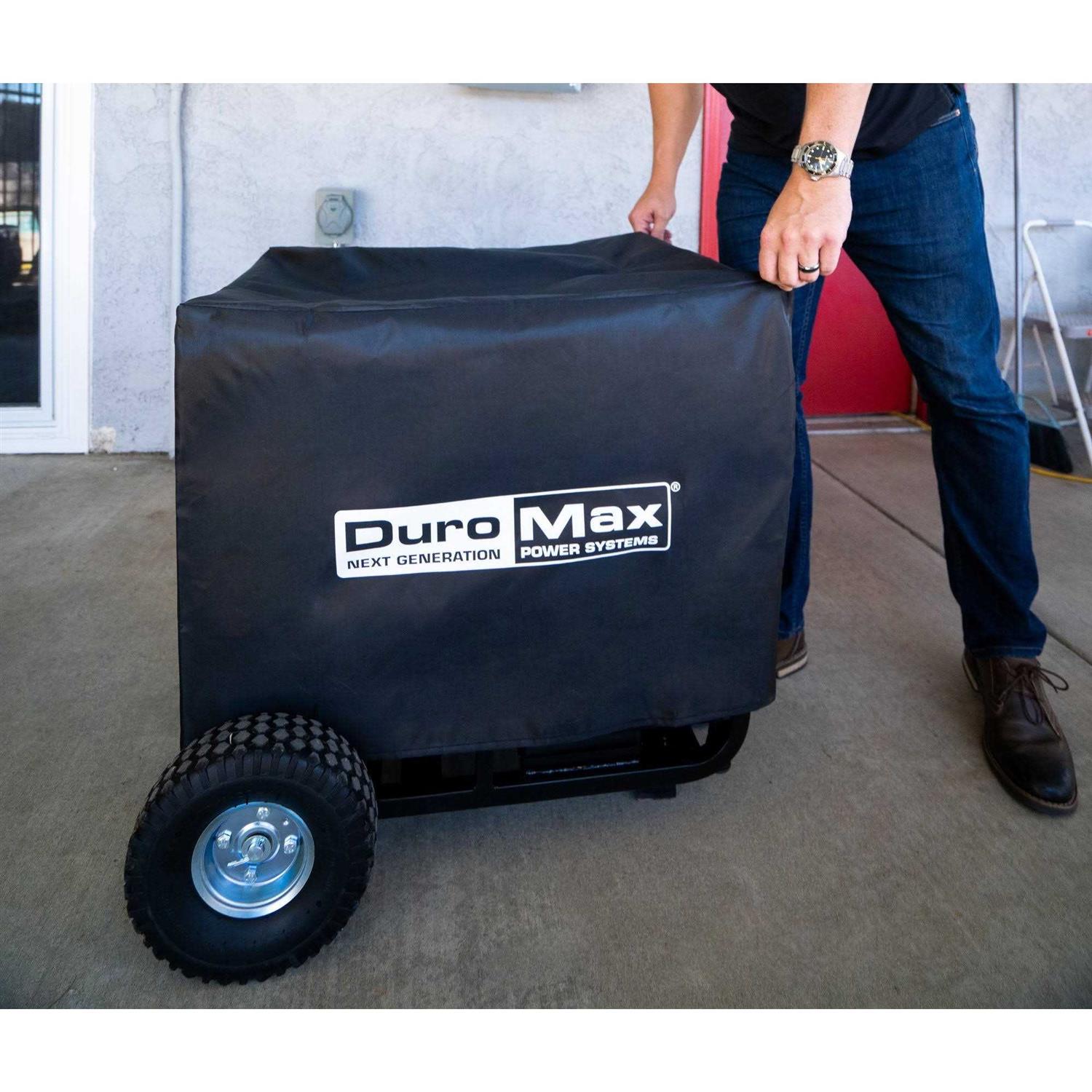 Choose from the available size options. Made from nylon fabric. Black with white logo. Fits generator with or without handles and wheel kit. Blocks UV rays. Keeps out dust, dirt & the elements. Protect your valuable investment with the DuroMax Weather Resistant Portable Generator Cover. This cover is made from durable nylon in black with the DuroMax logo printed in white on the front. Not only does it defend against the damaging effects of UV rays, but it blocks against long-term exposure to rain, snow, abrasive dirt and grime, pests, and more so your generator looks and performs like new for years to come. Multiple size options are available to fit your specific DuroMax or DuroStar model.