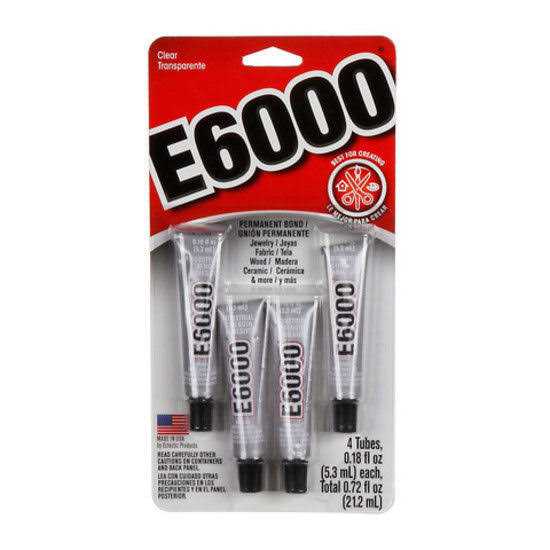 Eclectic Adhesive E6000 0.18oz 4pc Card Clear- A unique adhesive formulated to meet high performance industrial requirements, making it an exceptional craft adhesive. It is washer and dryer safe and has excellent adhesion to wood, metal, glass, fiberglass, ceramics, leather, fabric, styrofoam, rubber, vinyl and many plastics. It dries clear and is acid free when fully cured, making it safe to use for memory books and photo albums.
