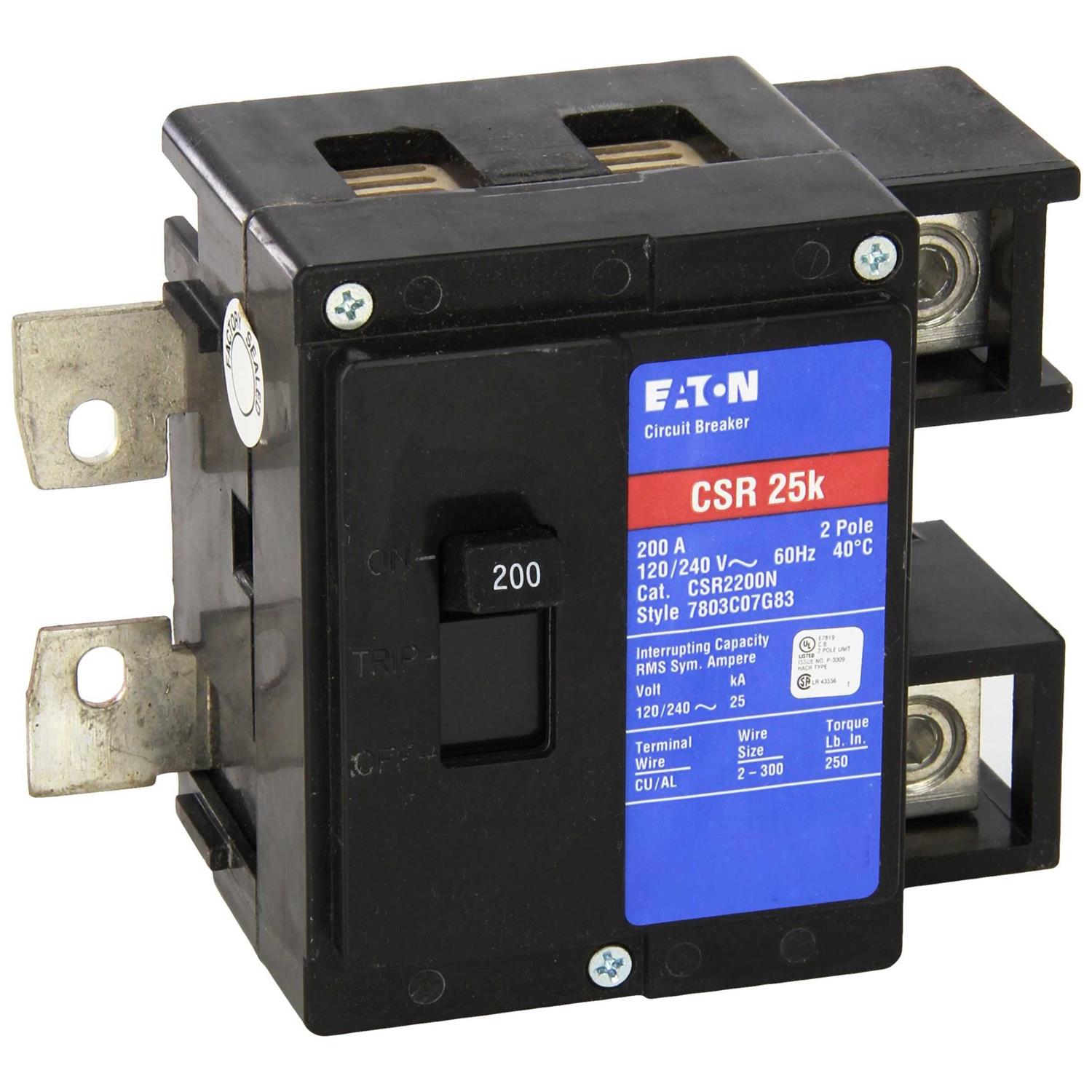 The Eaton CSR 200 Amp Double-Pole Main Breaker Kit is sized to trip before the total current draw of the panel exceeds the current carrying capacity of the feed from the electric company. This breaker is intended for use as a main breaker in a main breaker or meter breaker load center to deliver electricity to the branch circuit breakers. This unit can also be used as a service disconnect. For use as a main breaker in a main breaker or meter breaker load center or as a service disconnect Delivers electricity to branch circuit breakers within the load center Trips to the center position 120/240-Volt 25,000 AIC Suitable for use with type ECB unit enclosures, such as an Eaton meter breaker load center ANSI certified and UL listed Breaker is sized to trip before the total current draw of the panel exceeds the current carrying capacity of the feed from the electric company Bolt-on installation Double pole 200 Amp replacement circuit breaker Learn More About Circuit Breakers Here in our Buying Guide.