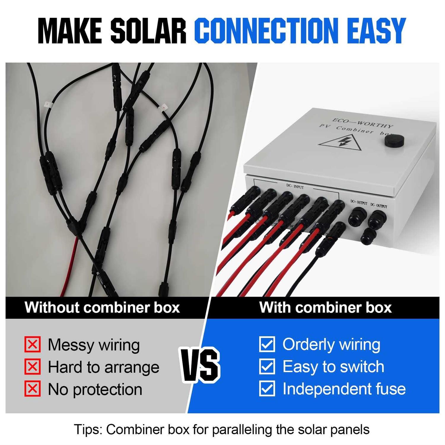 Both positive and negative with anti-thunder protection. Read more Application ECO-WORTHY PV Combiner Box is widely used in PV grid-tie and off-grid solar power system. Quickly cut off circuit, anti-thunder protection, anti-reverse, overload, etc.